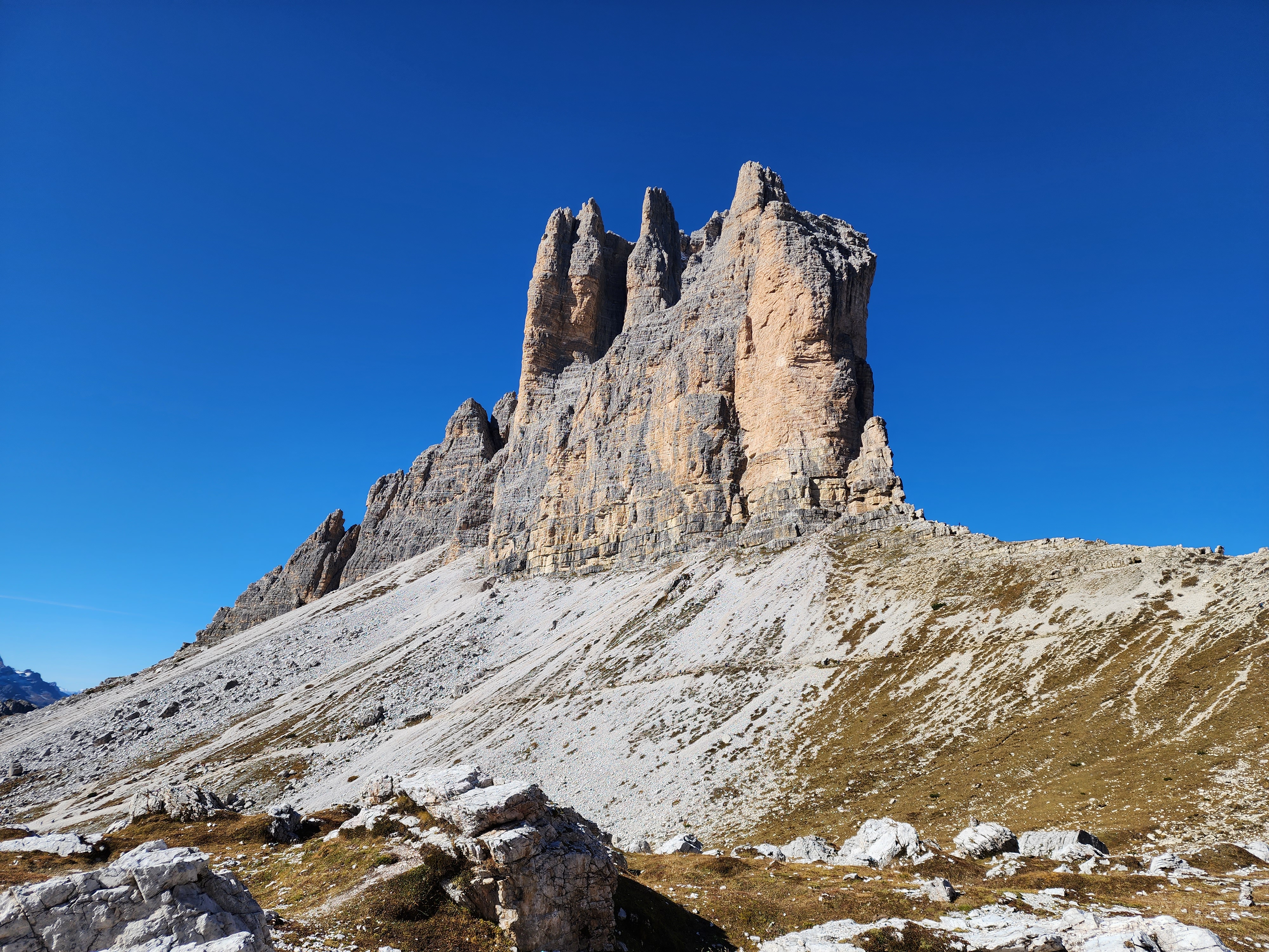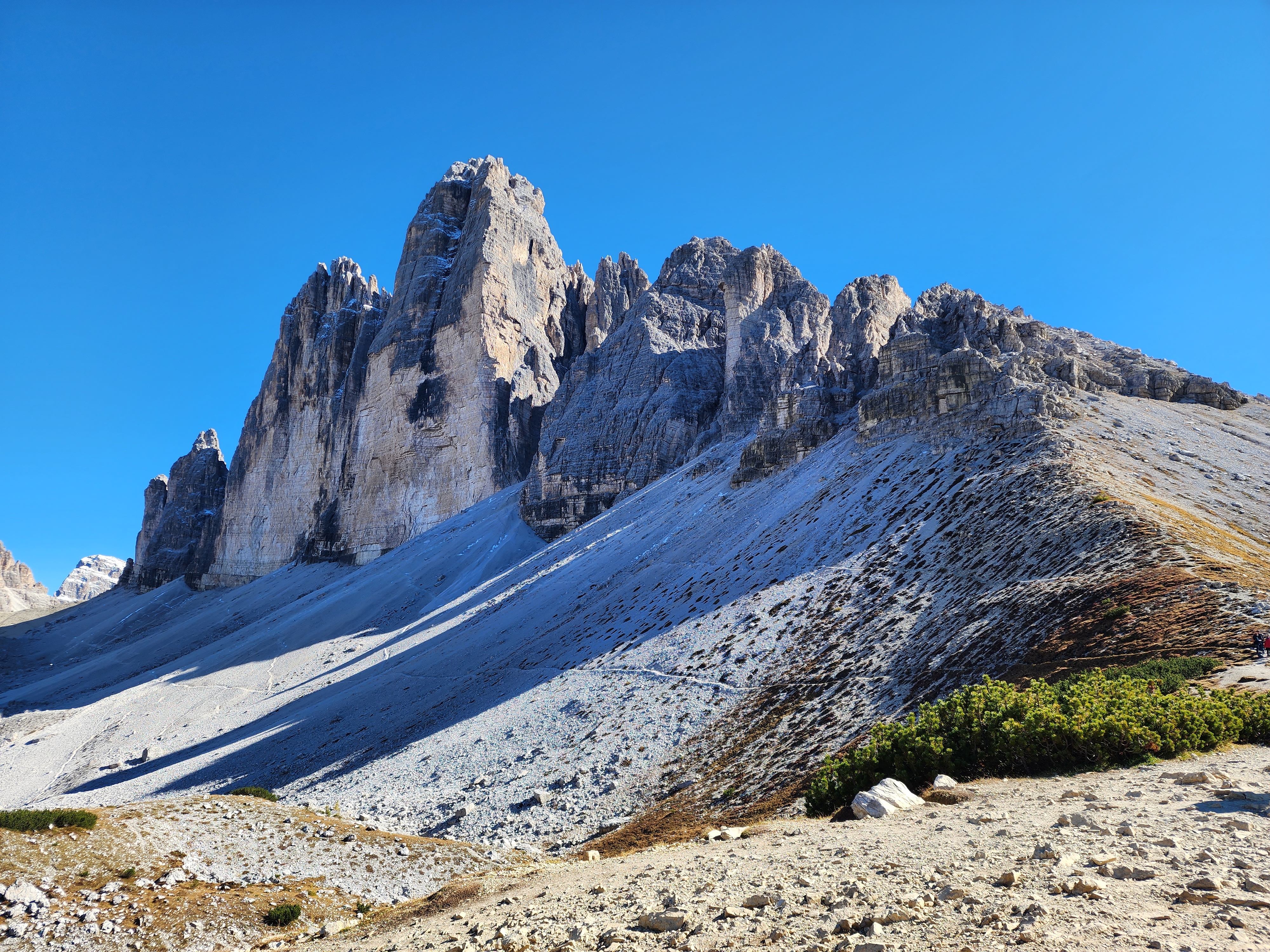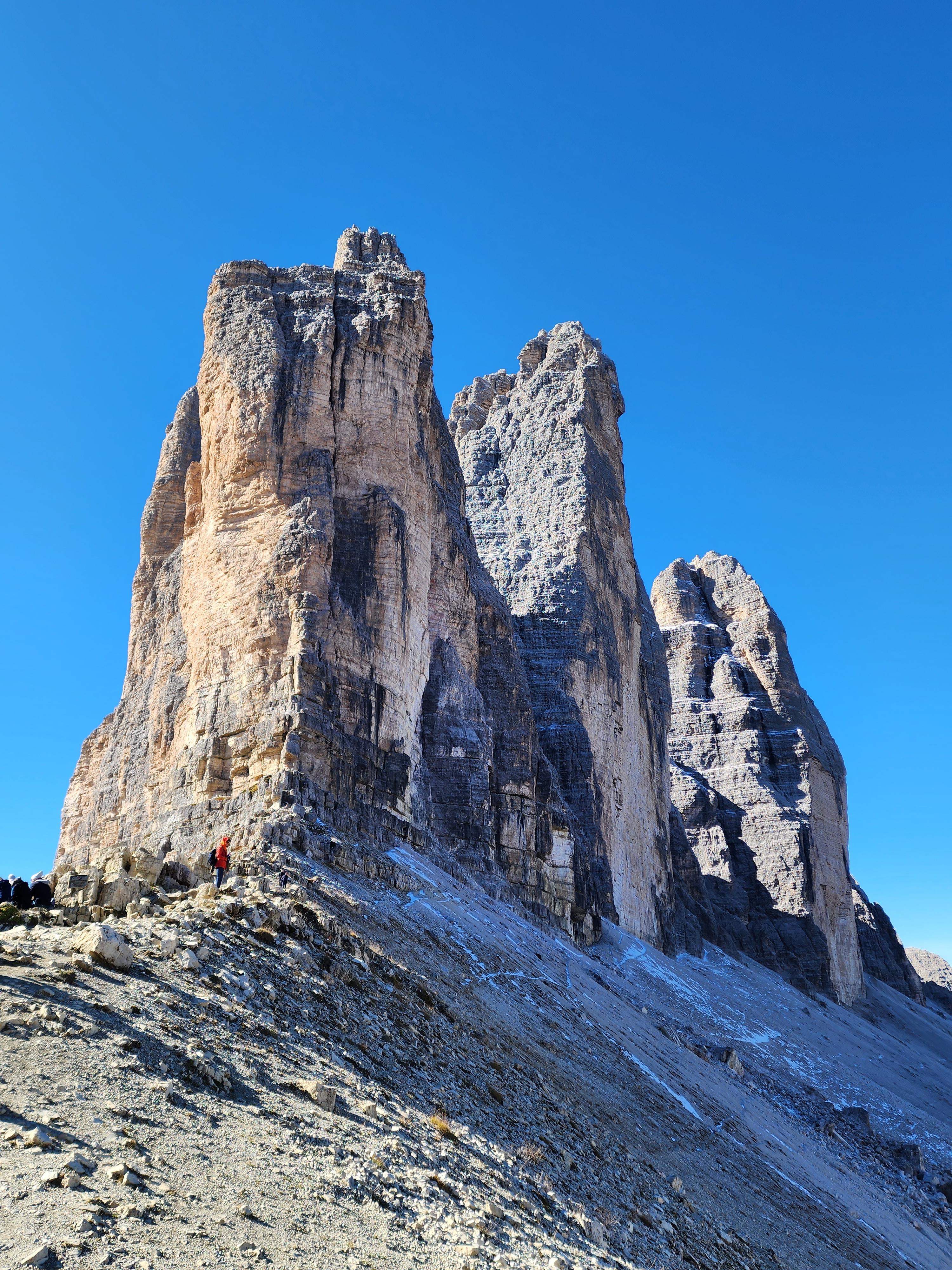 그 와중에 또 다른 분위기의 트레치메가 보인다. 첫날 갔던 친퀘토리와는 비교되지 않을 크기의 돌덩어리들이라 웅장함도 더하다. 물론 돌로미티 첫날의 감흥을 다 가진 친퀘토리에 비해 트레치메의 봉우리를 본 순간의 감흥은 덜하지만(혹은 트레치메 감상보다 트래킹이 우선이라 그럴지도).