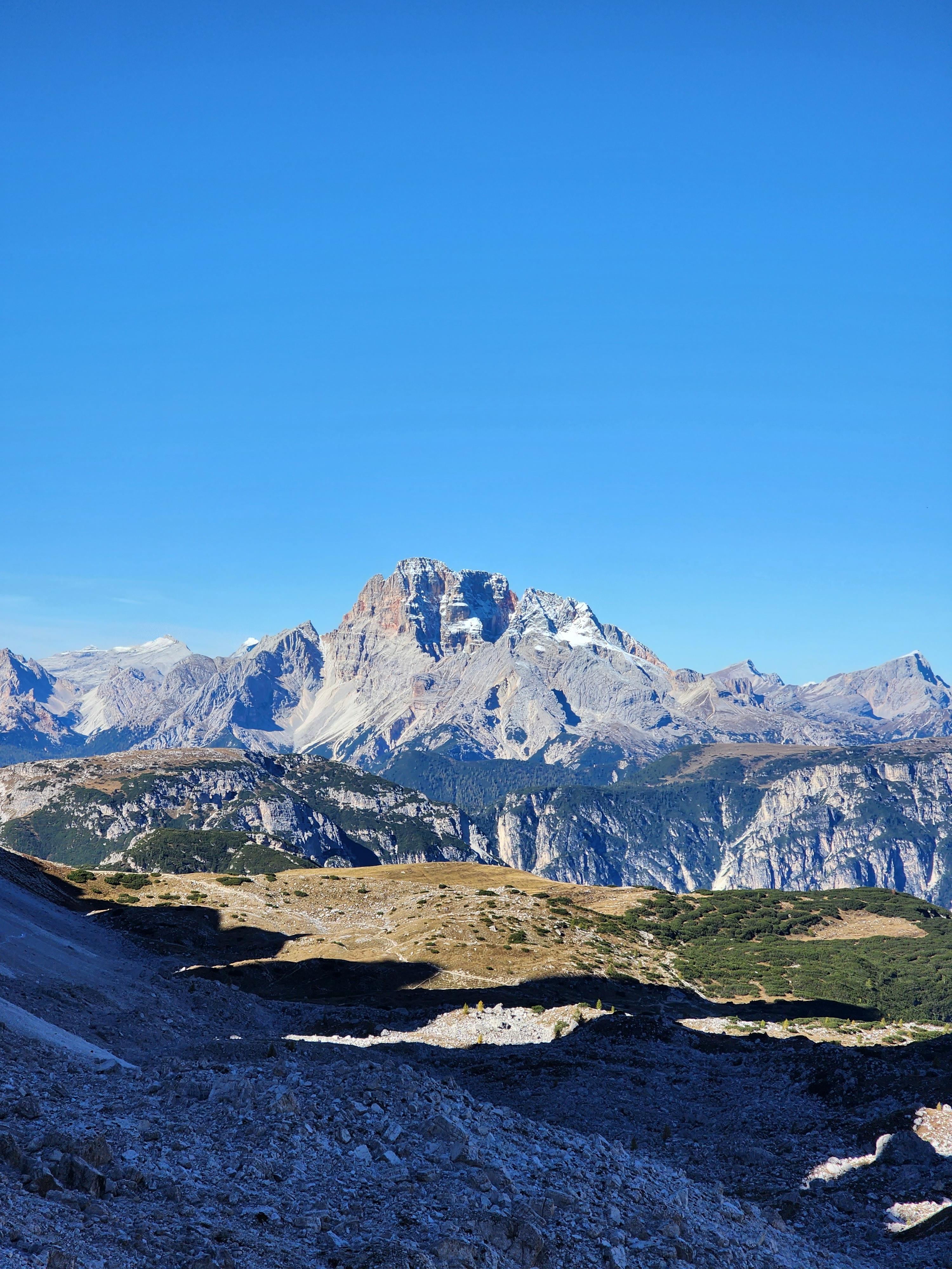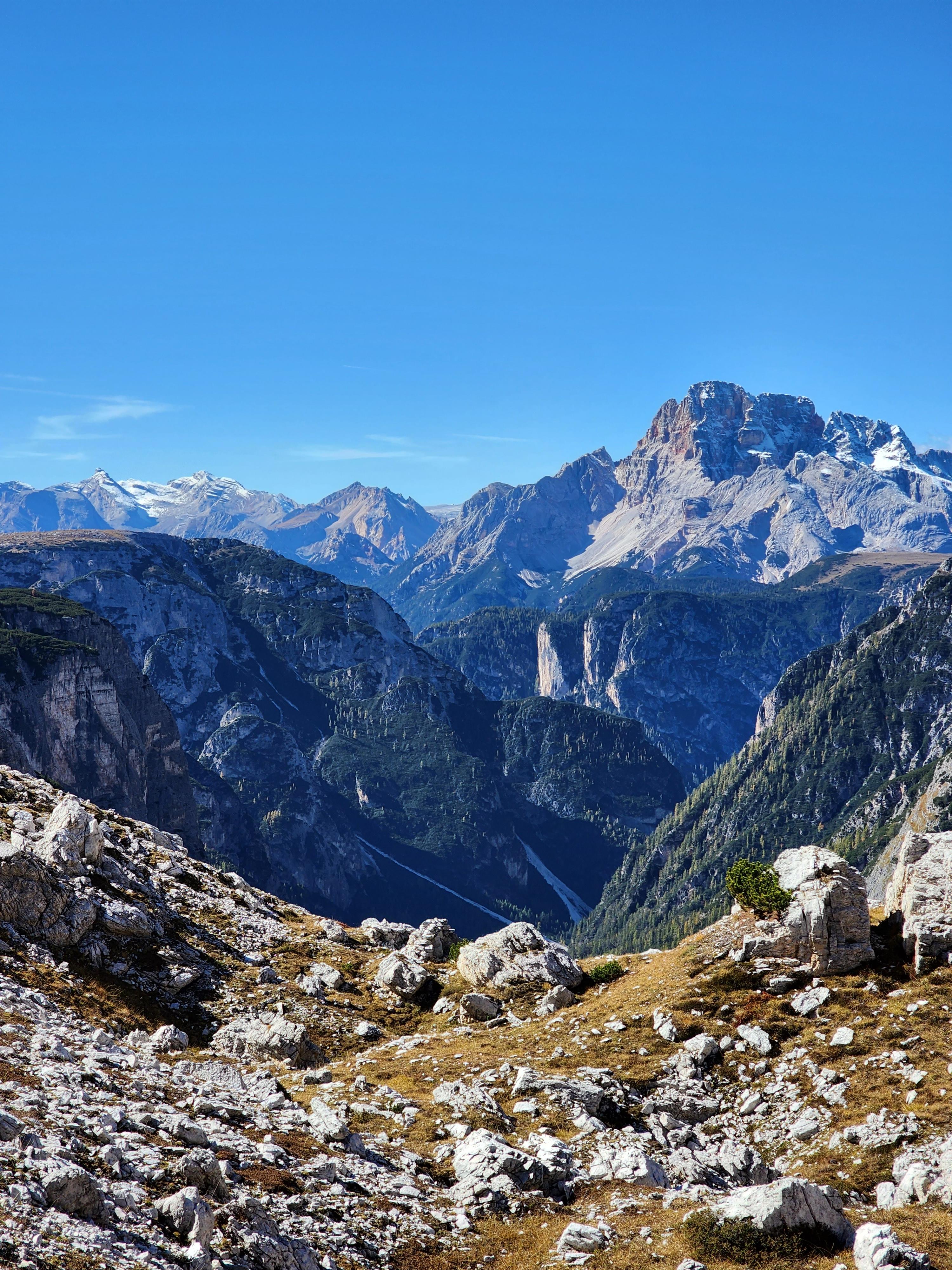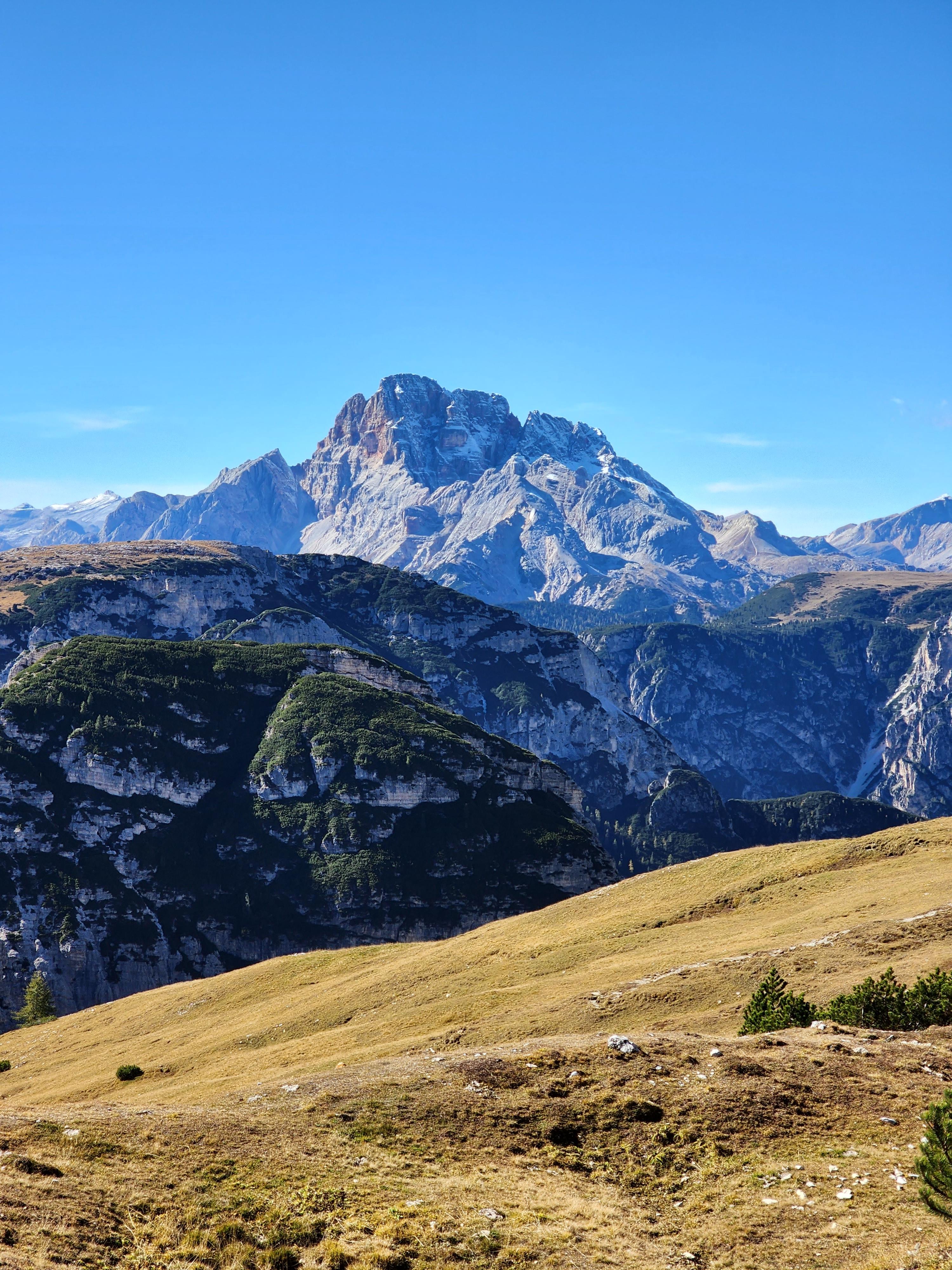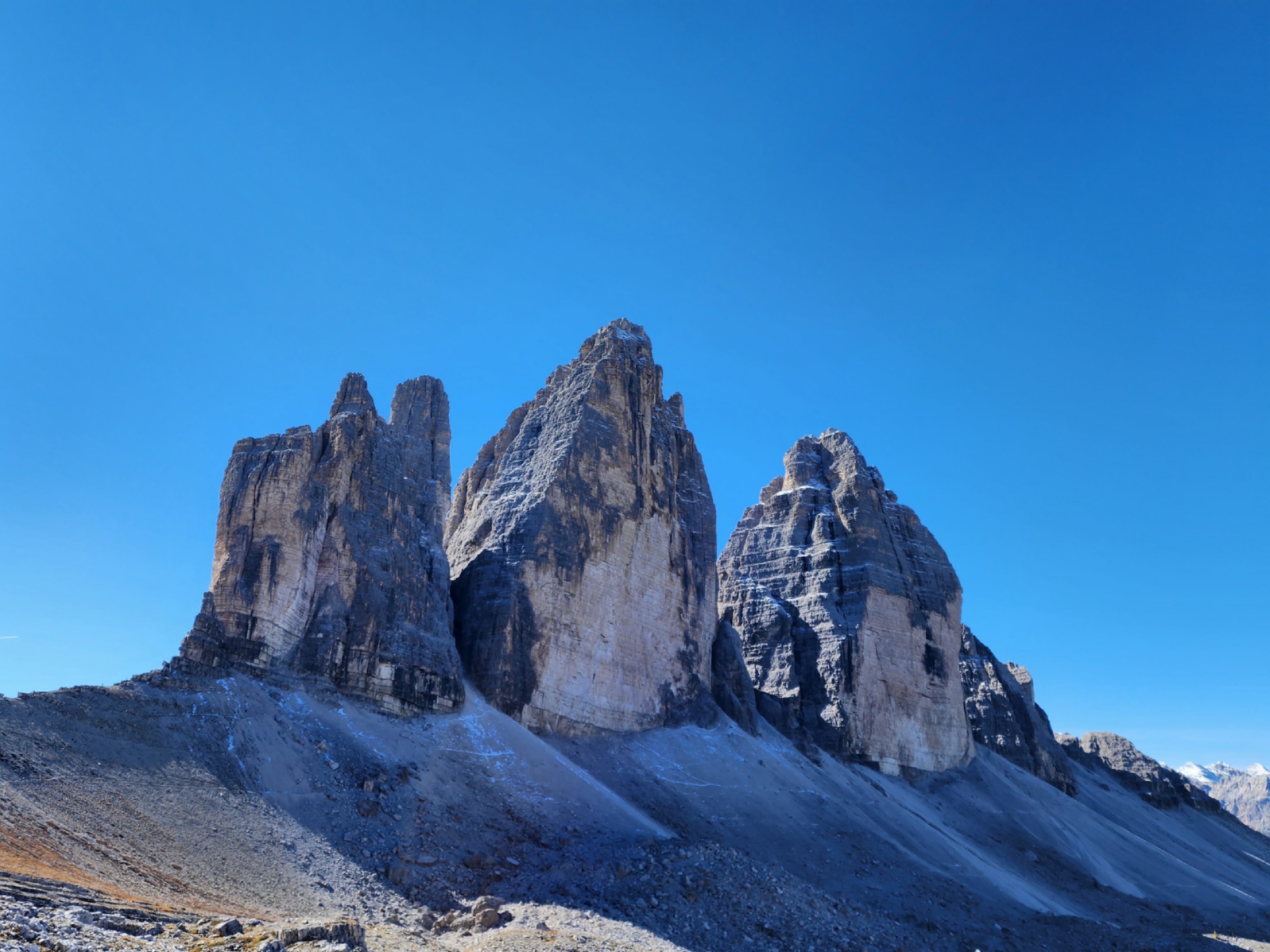 그 와중에 또 다른 분위기의 트레치메가 보인다. 첫날 갔던 친퀘토리와는 비교되지 않을 크기의 돌덩어리들이라 웅장함도 더하다. 물론 돌로미티 첫날의 감흥을 다 가진 친퀘토리에 비해 트레치메의 봉우리를 본 순간의 감흥은 덜하지만(혹은 트레치메 감상보다 트래킹이 우선이라 그럴지도).