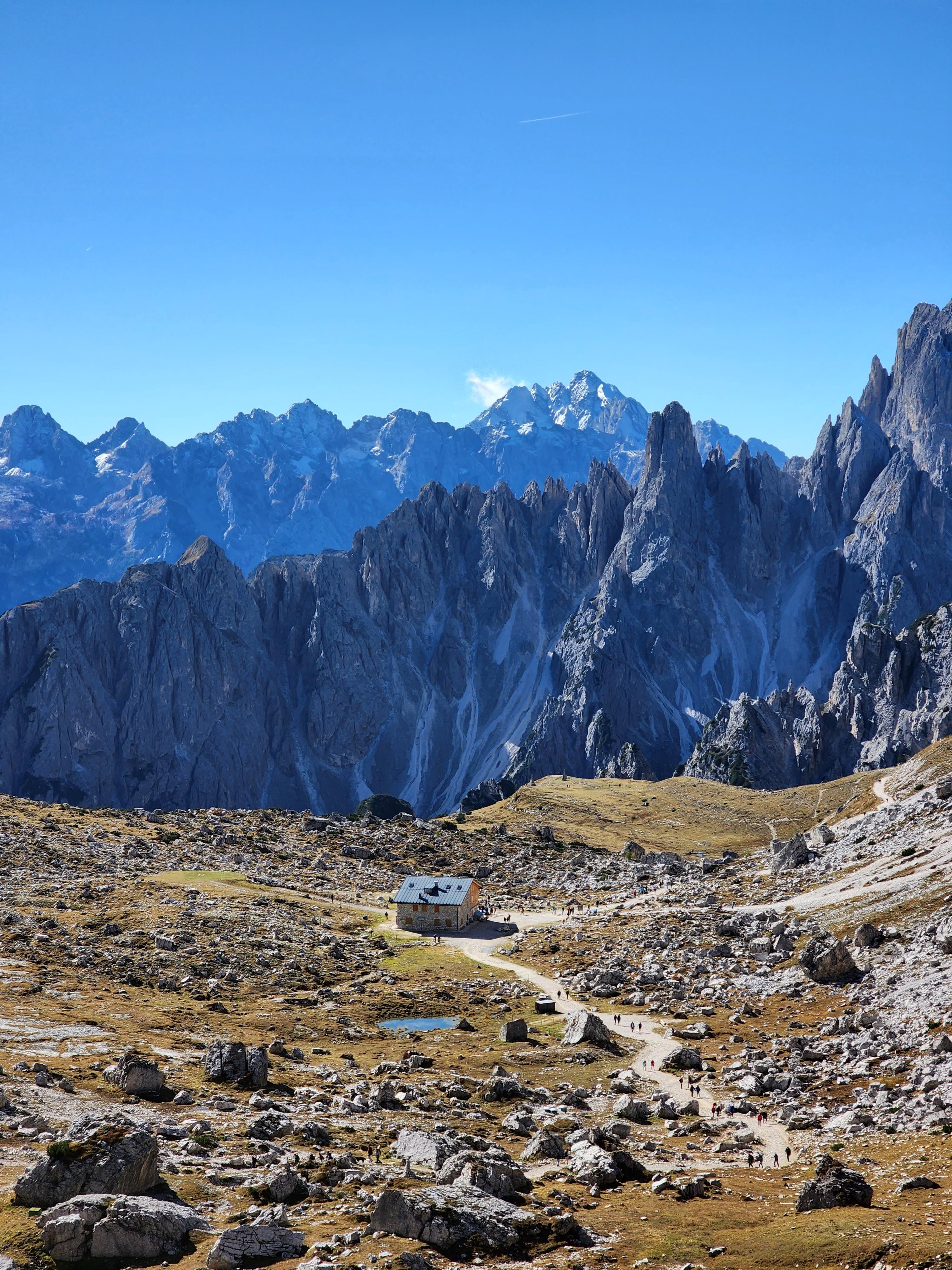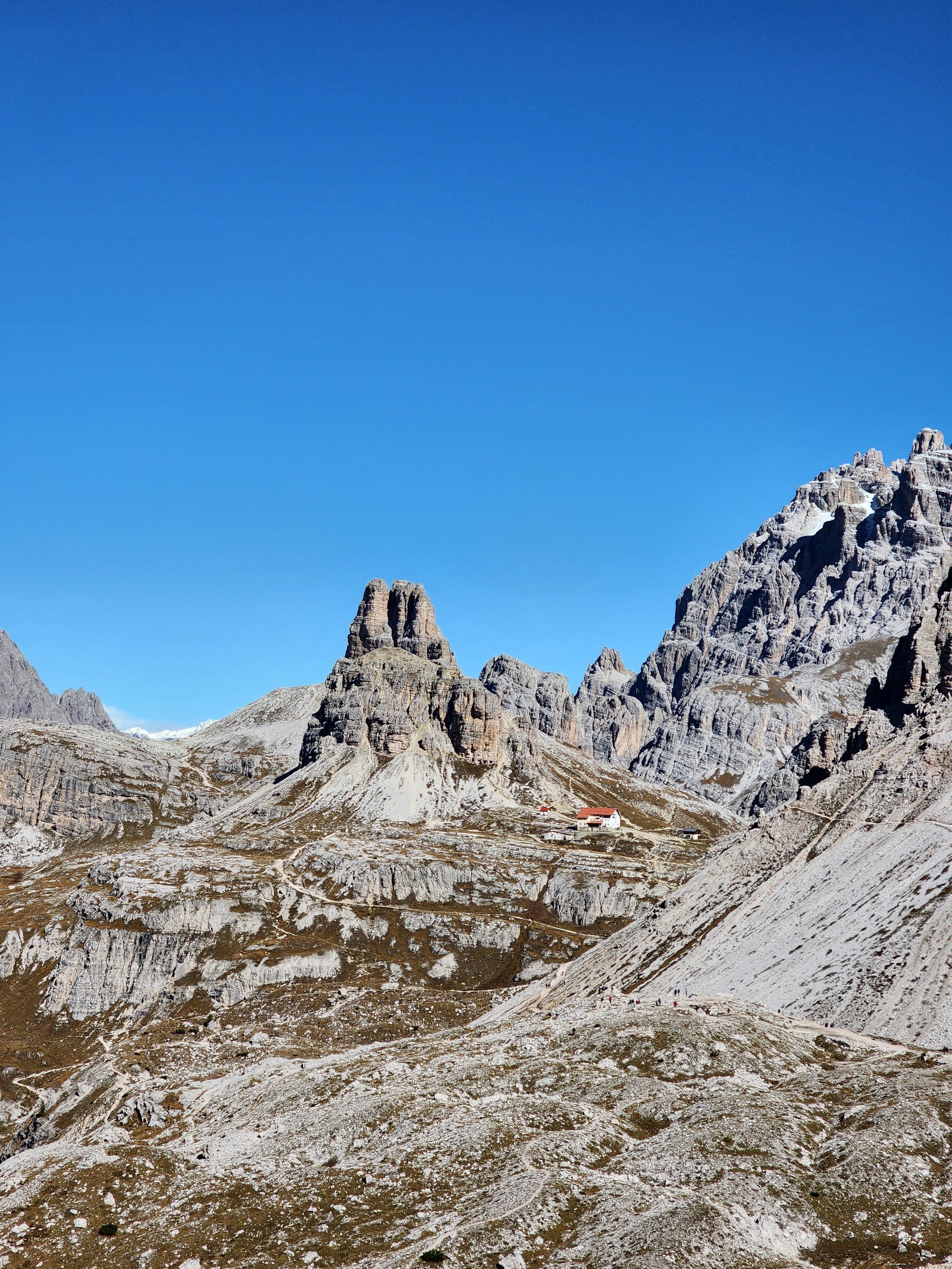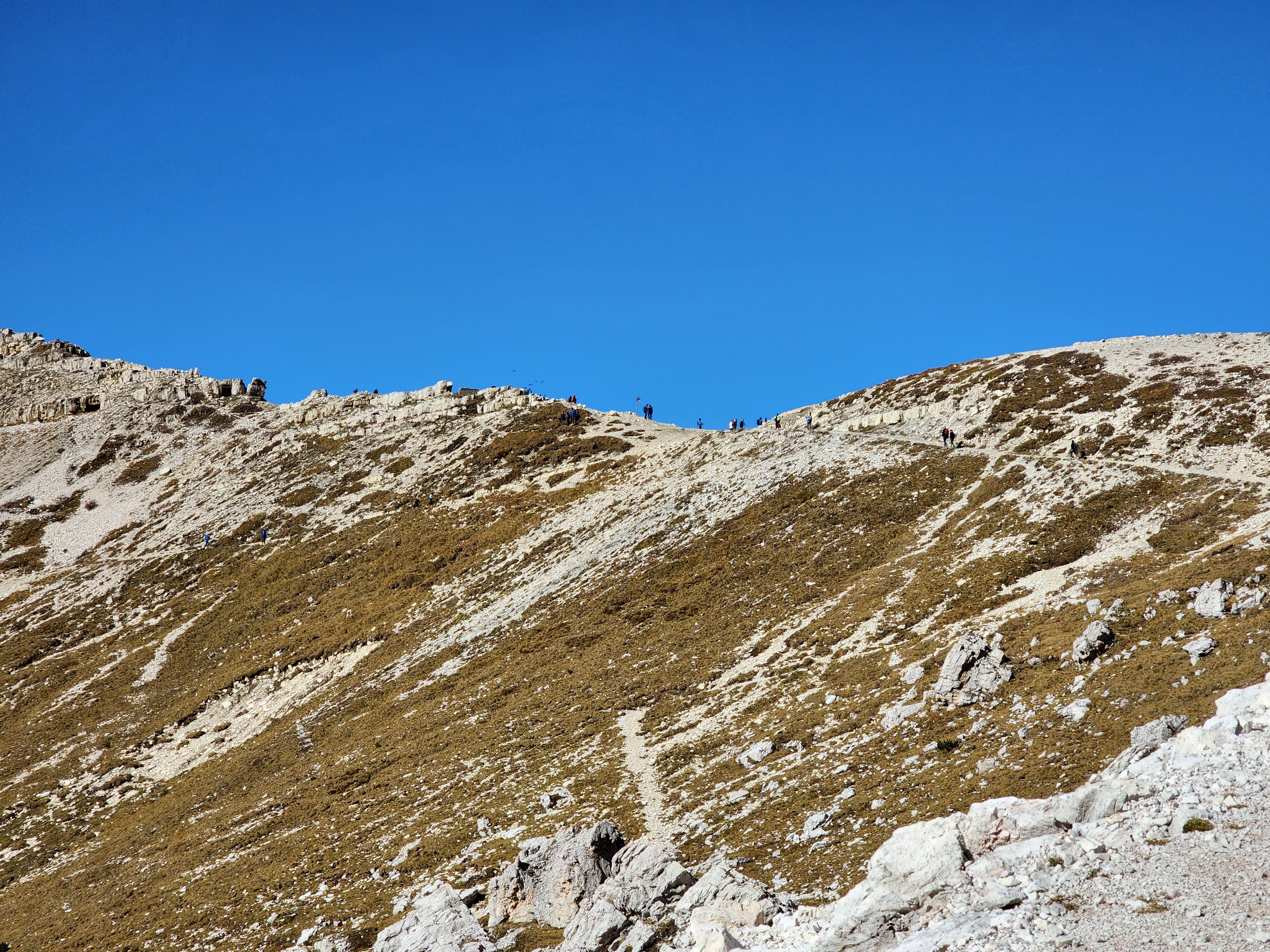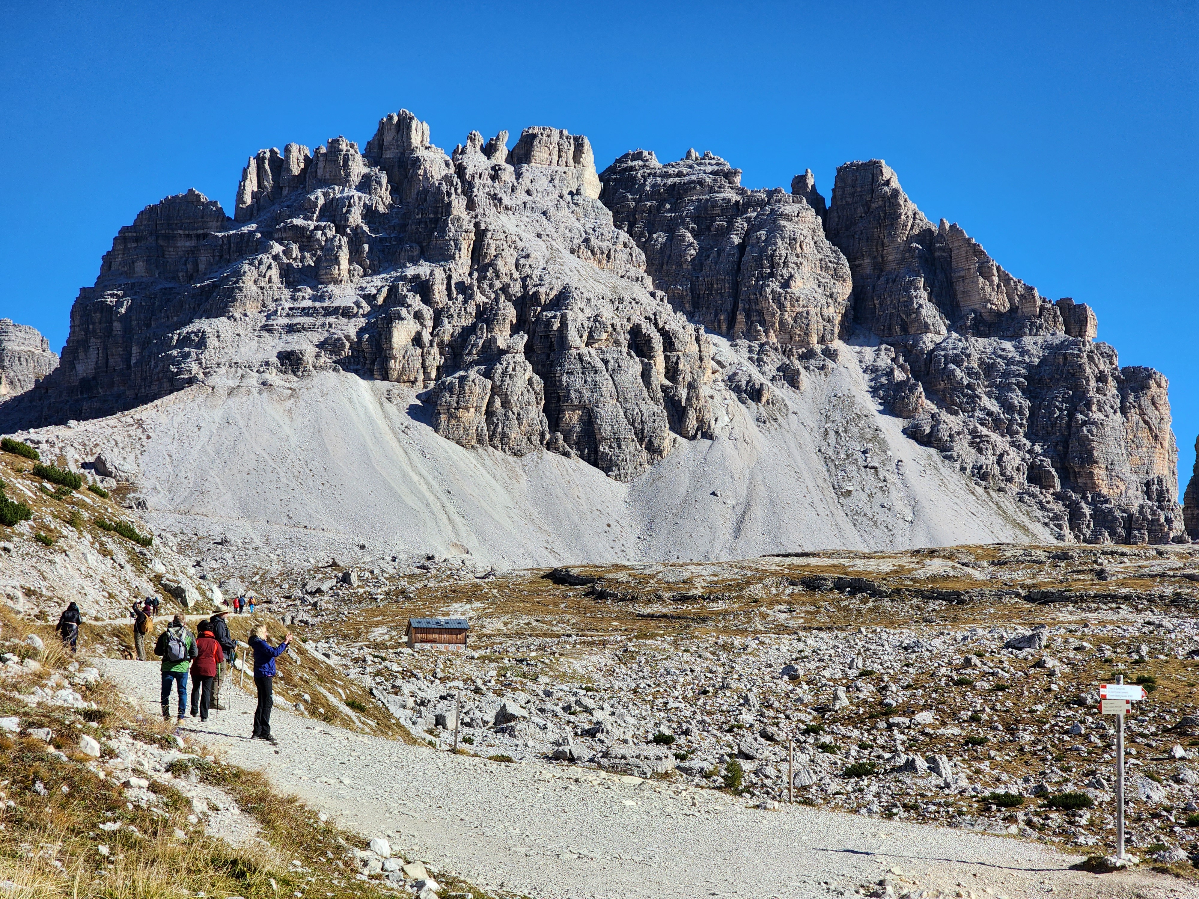 산장에서 멀어져 어느 정도 오르막을 올라오면, 트레치메의 옆면이 보이고 사람과 하늘과 언덕이 하나의 선으로 이어진 풍경이 나타난다. 어느새 산장은 미니어처처럼 작게 보인다. 이곳이 트레치메 트래킹의 중심지라고 보면 된다. 비탈길 언덕을 오르면 팻말이 하나 보이고, 팻말의 뒤쪽으로는 트레치메가, 앞쪽으로는 저 멀리 로카텔리 산장과 뷰포인트인 동굴이 보인다.