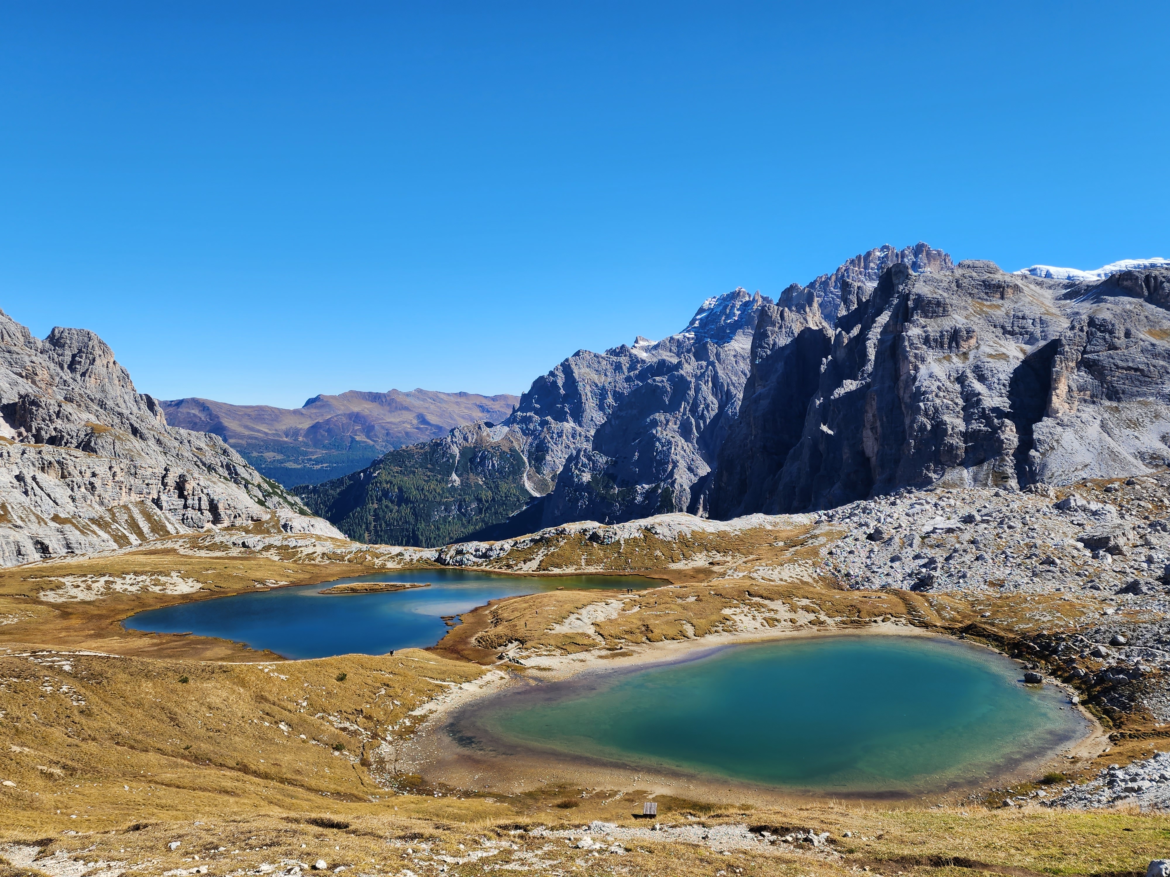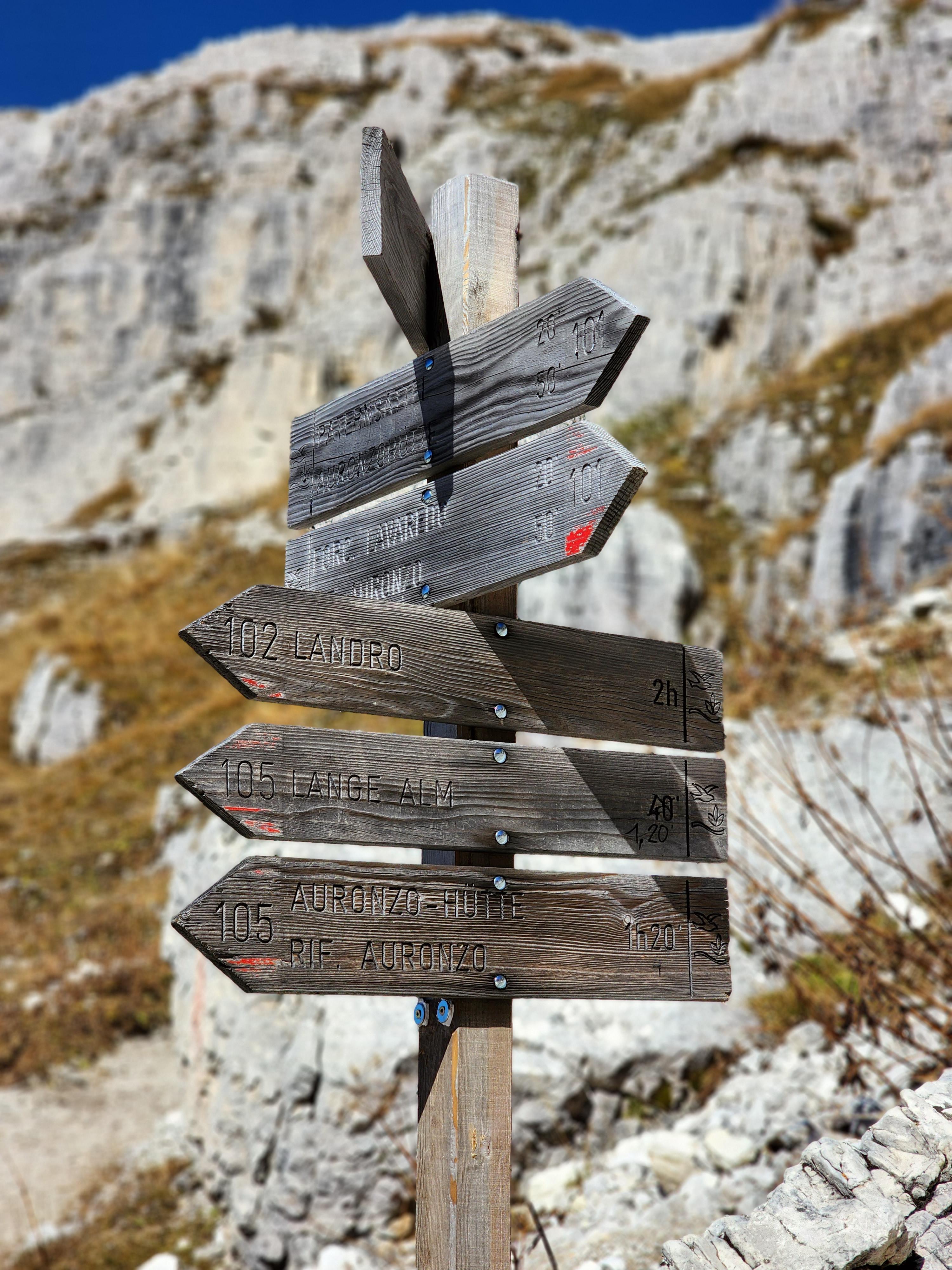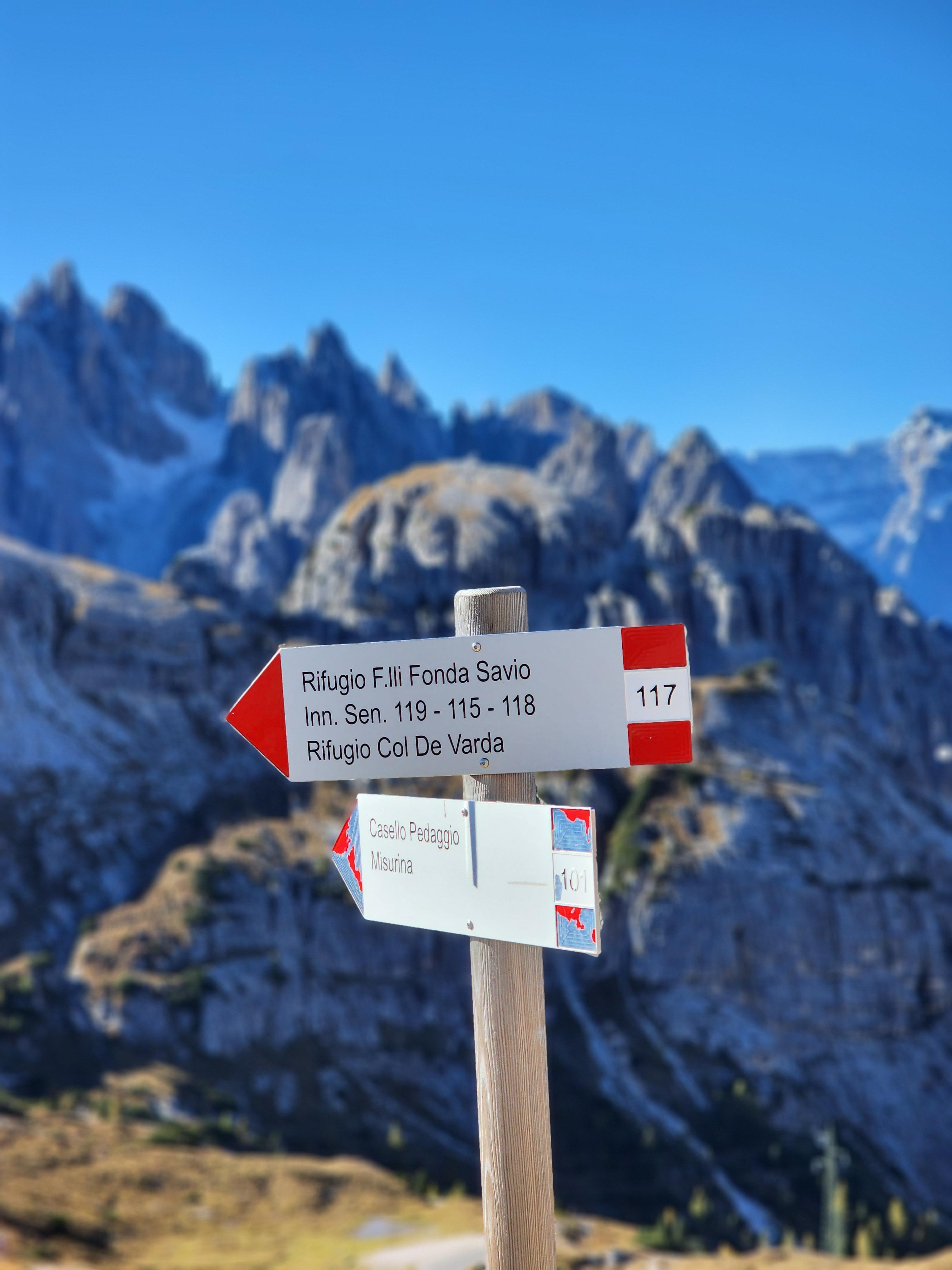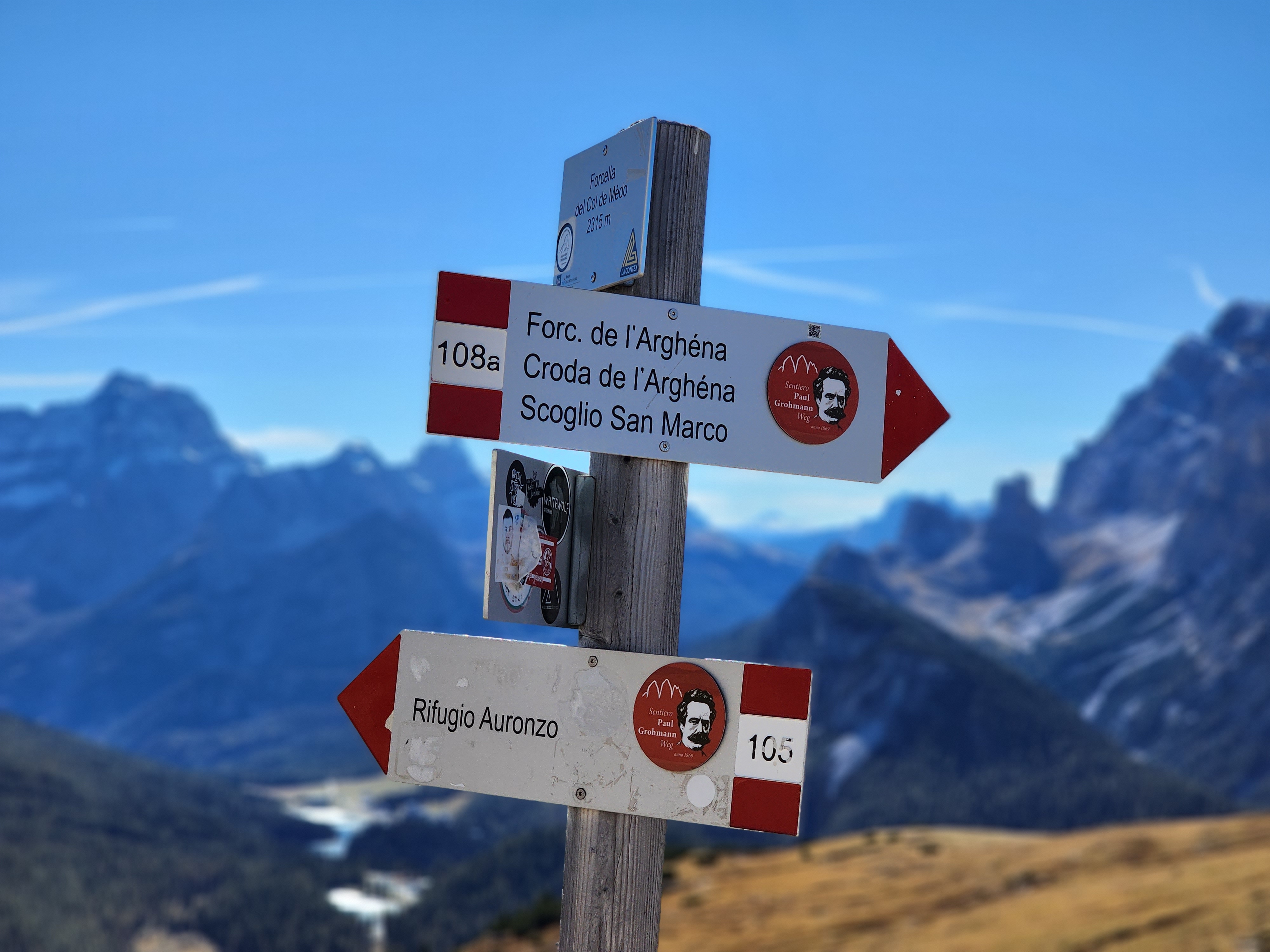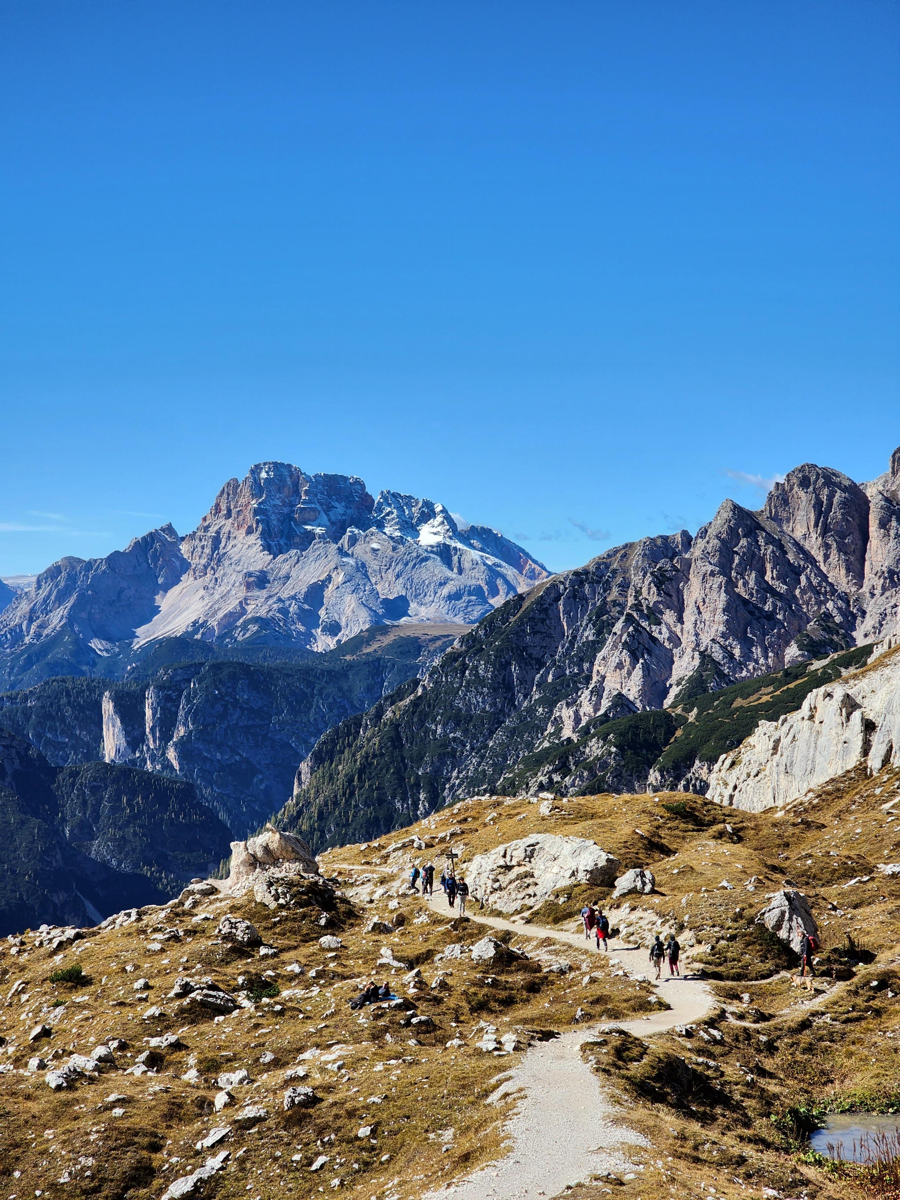 산장에서 멀어져 어느 정도 오르막을 올라오면, 트레치메의 옆면이 보이고 사람과 하늘과 언덕이 하나의 선으로 이어진 풍경이 나타난다. 어느새 산장은 미니어처처럼 작게 보인다. 이곳이 트레치메 트래킹의 중심지라고 보면 된다. 비탈길 언덕을 오르면 팻말이 하나 보이고, 팻말의 뒤쪽으로는 트레치메가, 앞쪽으로는 저 멀리 로카텔리 산장과 뷰포인트인 동굴이 보인다.