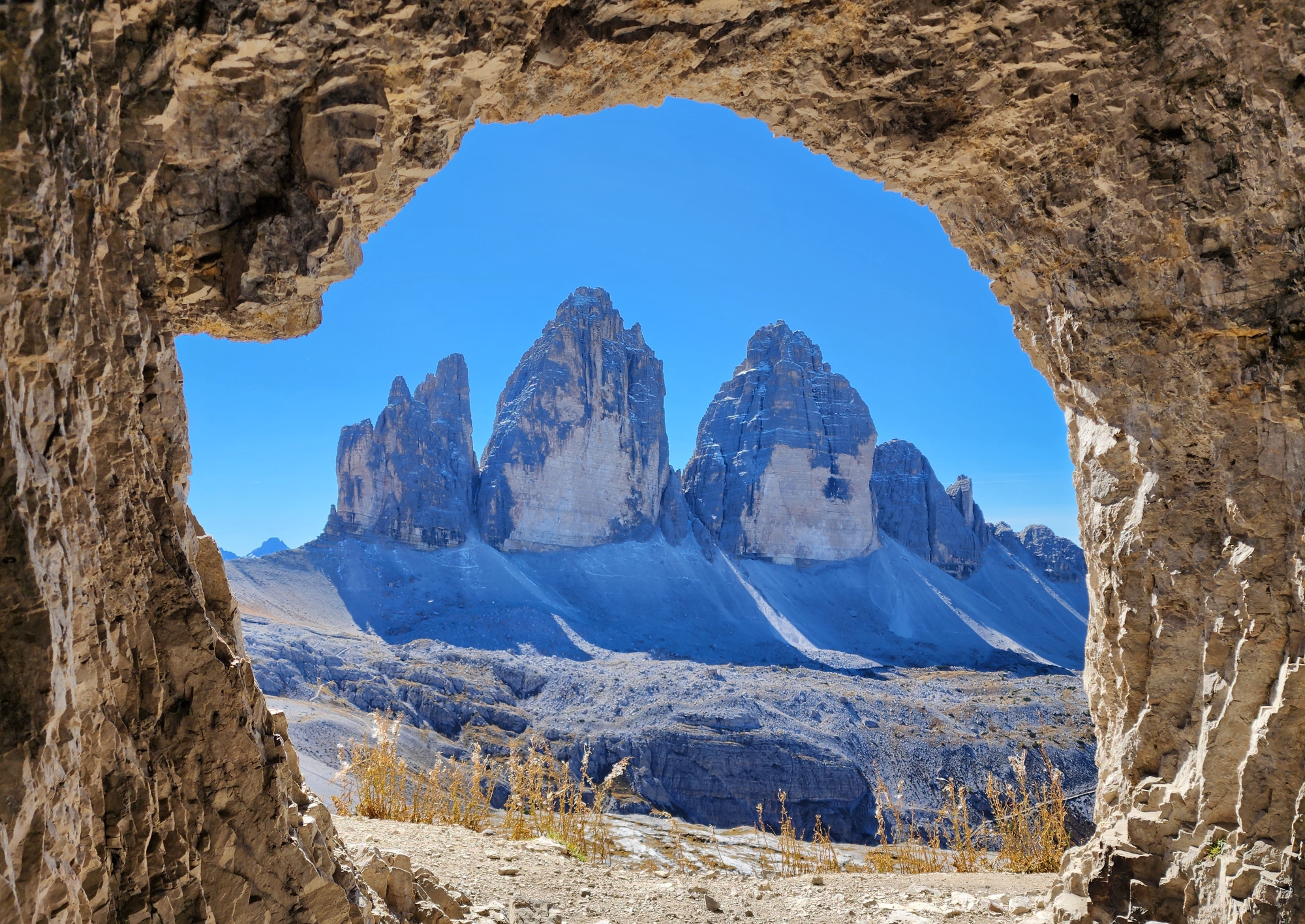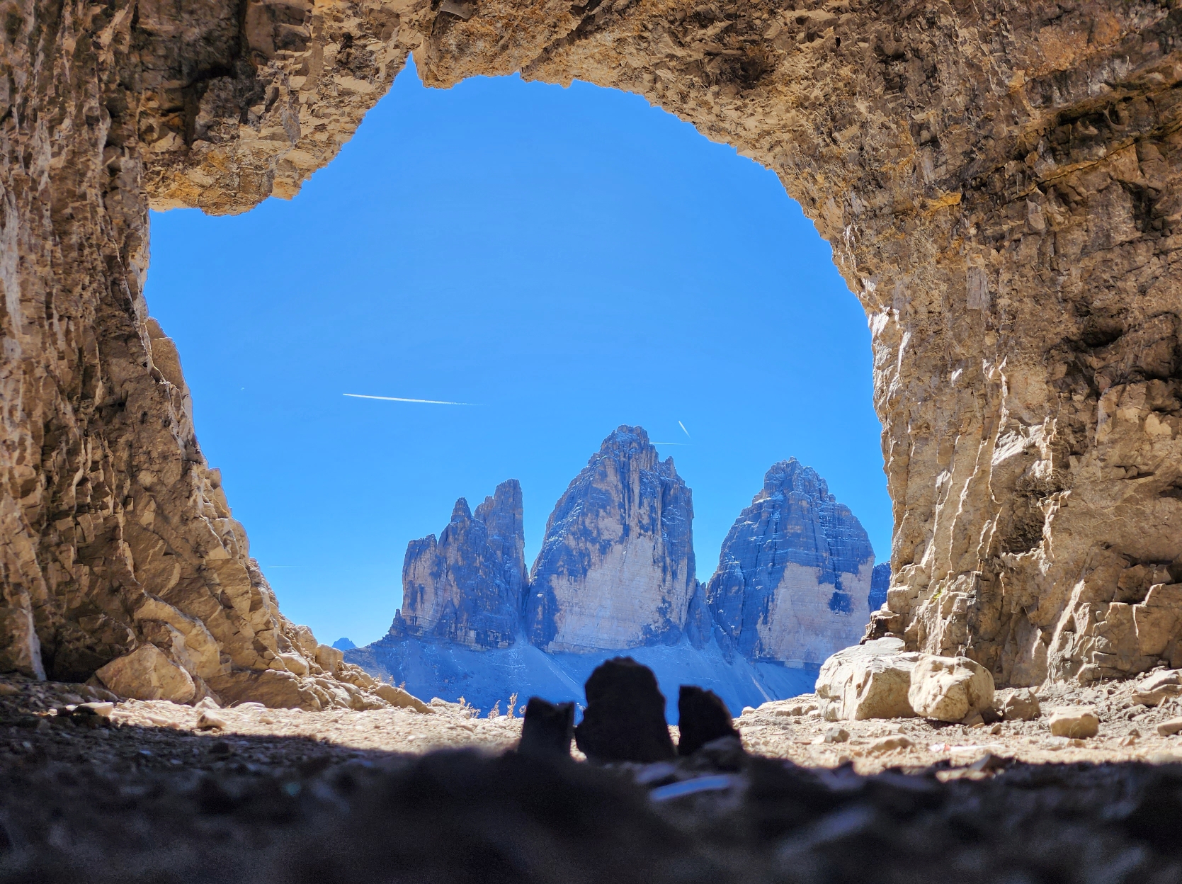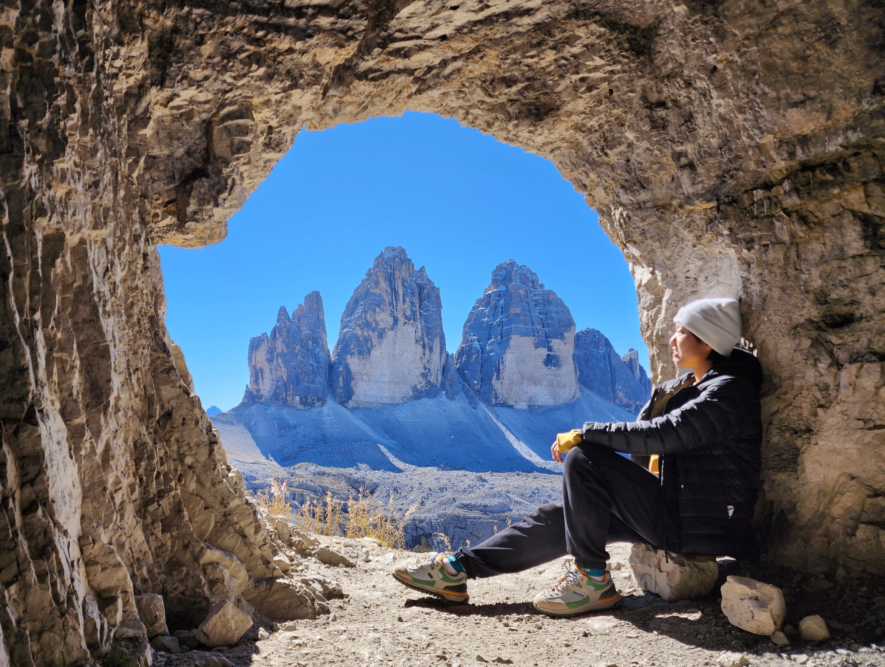 그리고 대망의 트레치메 동굴 뷰포인트. 블로그나 카페에서 트레치메의 세 봉우리가 동굴 프레임 속에서 등장하는 사진을 봤다면 이곳에서 찍은 것이다. 산장 위쪽으로 보면 동굴이 여러 개 나 있는데, 제1차 세계대전 당시 참호로 파 둔 굴이라고 한다. 그중에 가장 깊은 중앙의 굴 안쪽으로 들어가 바깥을 보면 트레치메의 세 봉우리가 한눈에 들어온다. 정말 사진에서 본 그대로라 신기했다.
