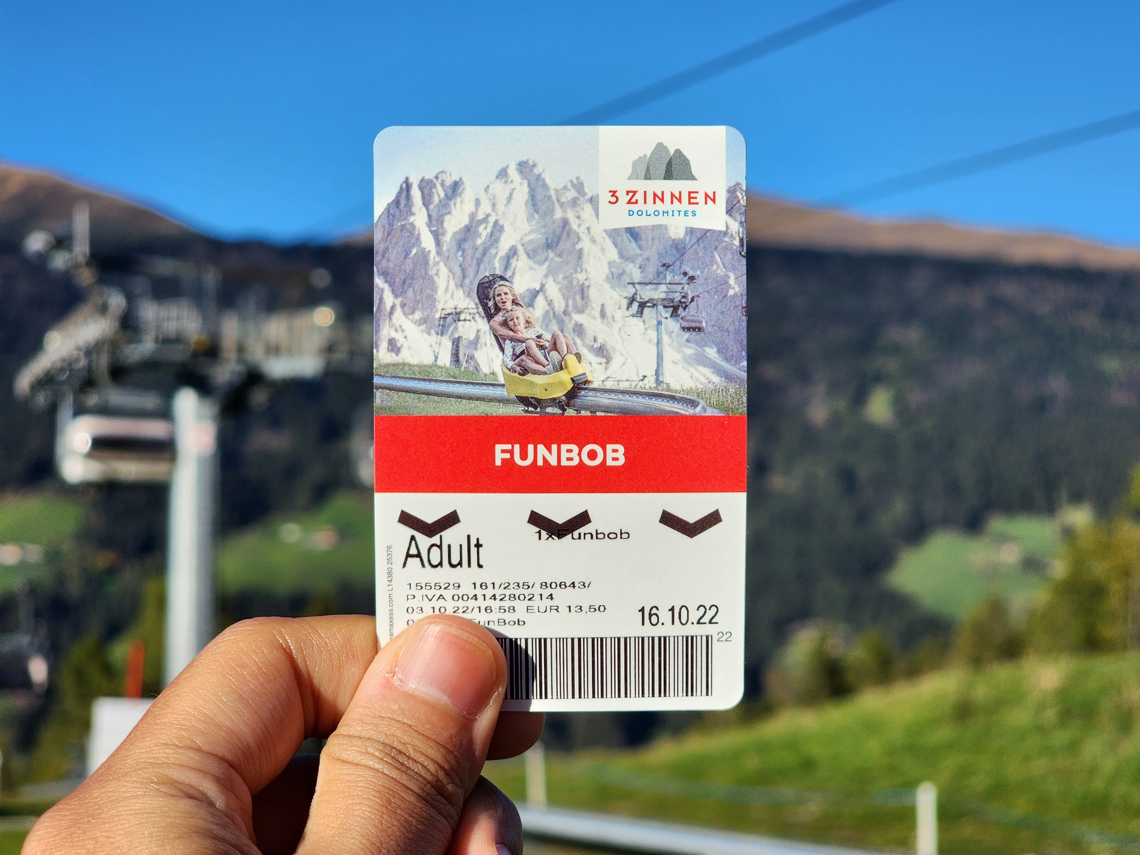 그리고 나서 부랴부랴 펀봅(FunBob)을 타러 이동! 펀봅은 부산의 루지 같은 느낌의 놀이기구라 보면 되는데, 루지는 레일이 넓고 본인이 방향 조절을 할 수 있는 반면 펀봅은 고정된 레일을 따라 내려와야 한다는 점이 다르다. 하지만 돌로미티에서 타는 펀봅은 경치가 상상 이상이라는 점도 있다. 리프트를 타고 올라가 펀봅 이용권을 구매하면 되는데, 리프트는 온라인에서 구매하는 게 더 싸다. 리프트 편도는 13유로, 펀봅 1회권은 14유로로 도합 27유로라 싼 편은 아니지만 일단 타 보면 비싸다는 말이 싹 사라진다.