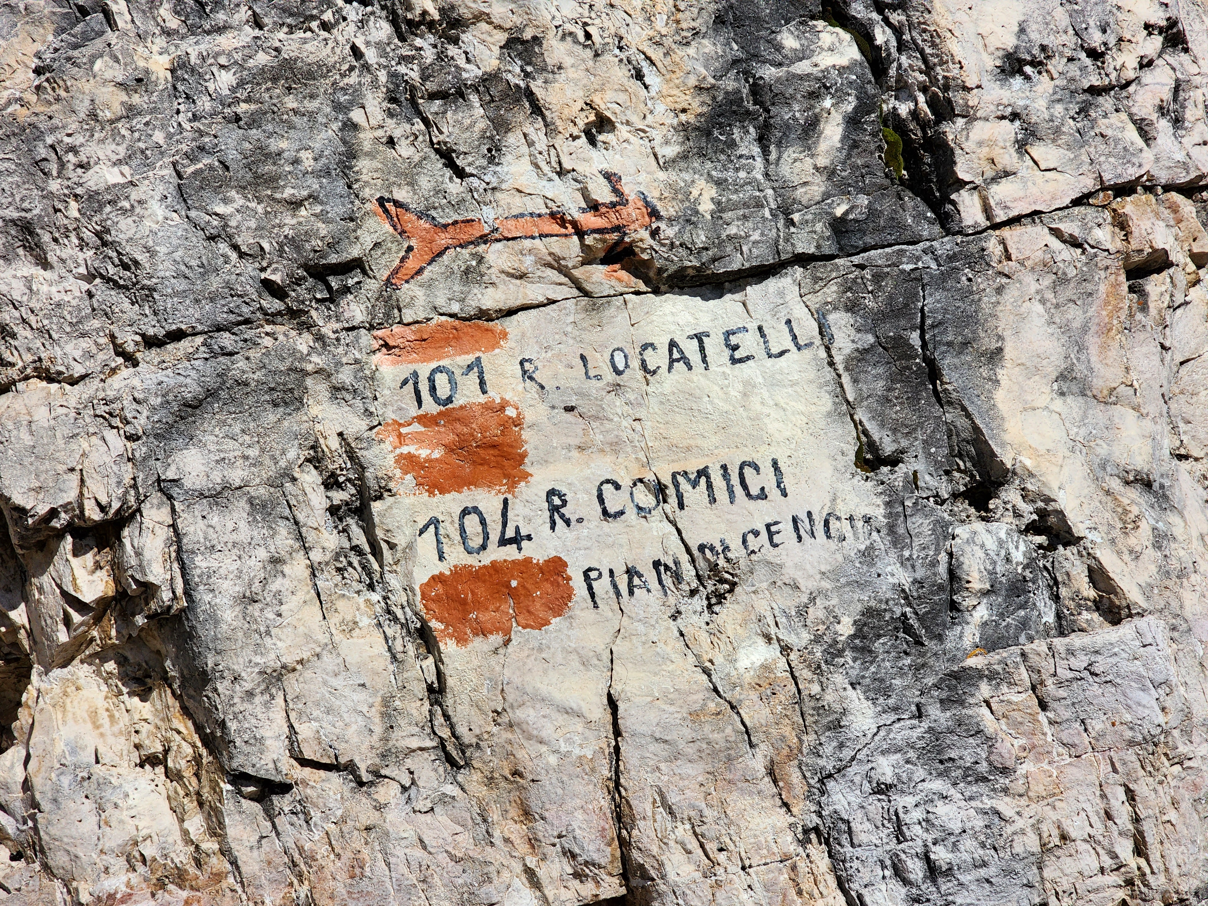 트래킹을 시작하고 나서 몇 분 후에야 깨달은 건데, 산장에 왔을 때부터 우리는 트레치메를 보고 있던 거였다. 그러니까 101번 길에서 105번 길로 나아가는 건 트레치메의 세 봉우리를 길게 돌아보는 루트였고, 걷는 내내 트레치메를 머리 위에 두게 되는 거였음. 트래킹이란 단어에 꽂혀있다 보니 걷는 것만 신경 썼지, 걸으면서 무엇을 보게 되는지 잠시 까먹은 거다. 물론 깨달은 후에는 한시도 쉬지 않고 고개를 들어 걸어가는 순간마다 다양한 각도로 변하는 트레치메를 눈에 담으려고 노력했다(물론 트레치메도 온전히 세 봉우리만 보이지는 않고, 다양한 각도에서 보면 네 개처럼 보이기도 한다).