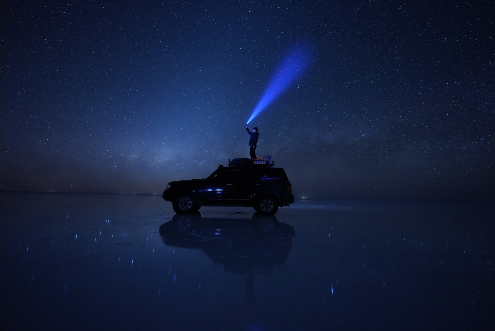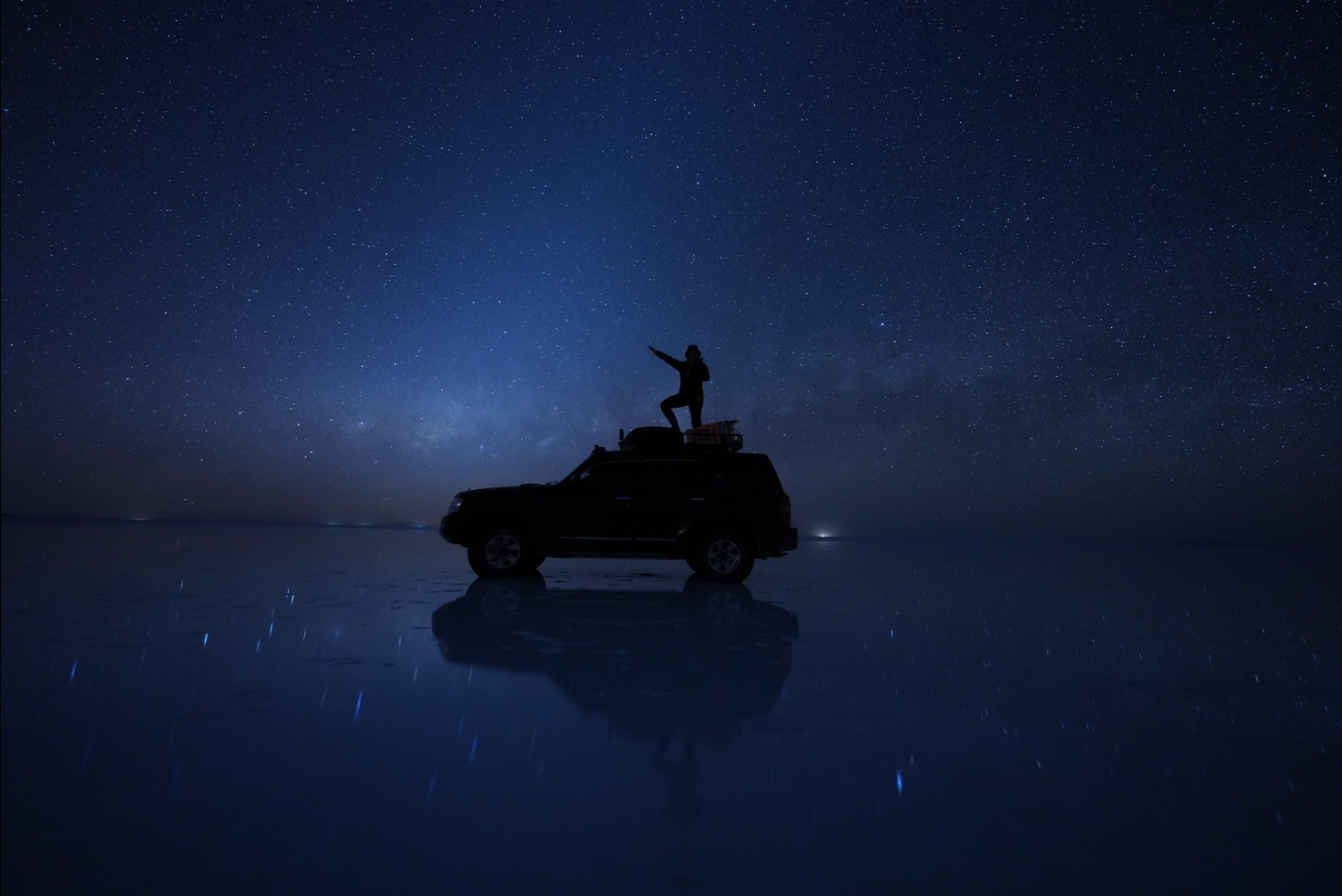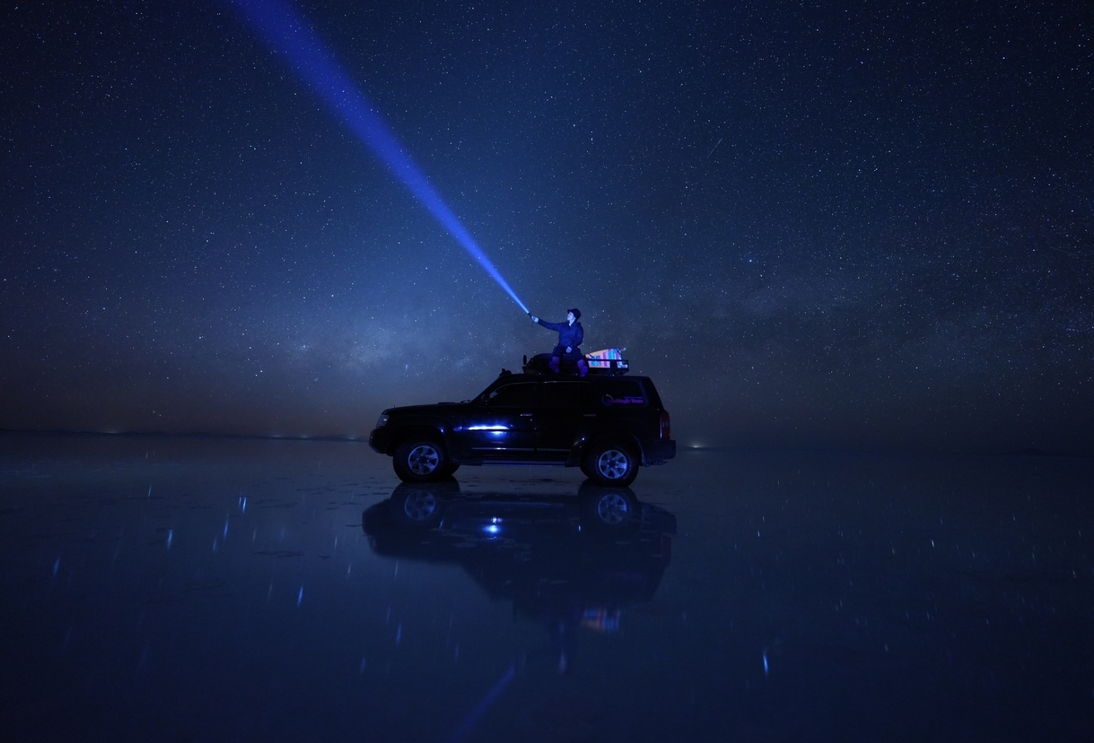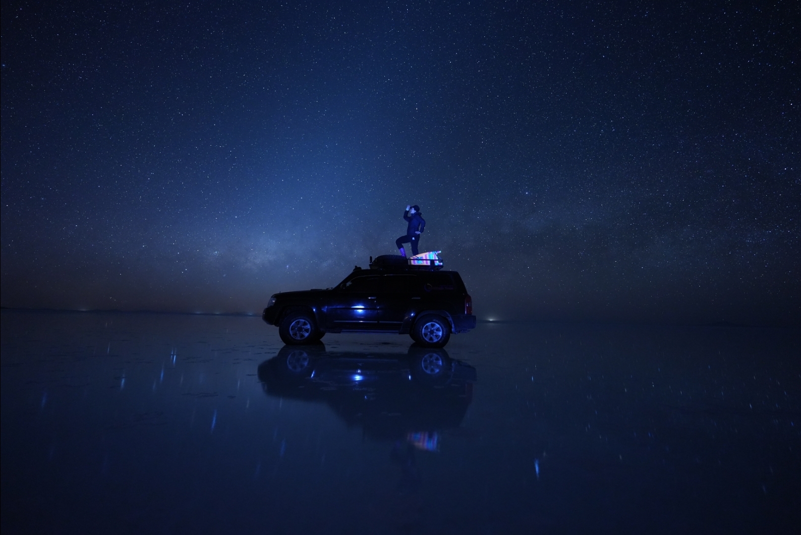 그리고 아리엘의 진가가 드러나기 시작했다. 바닥에서 개인 사진을 여러 장 찍고 나서 차 위에 올라간 사진을 찍기 시작했는데, 스킬이 엄청나더라. 깜깜한 우유니에서 별과 사람을 어떻게 같이 찍나 했더니, 일단 사진을 오래 노출하고 그 사이에 색을 칠할 사람과 차를 작은 손전등으로 꼼꼼하게 비추더라. 그러면 반짝반짝 빛나는 별과 함께 색이 입혀진 사람이 사진에 이쁘게 나온다.