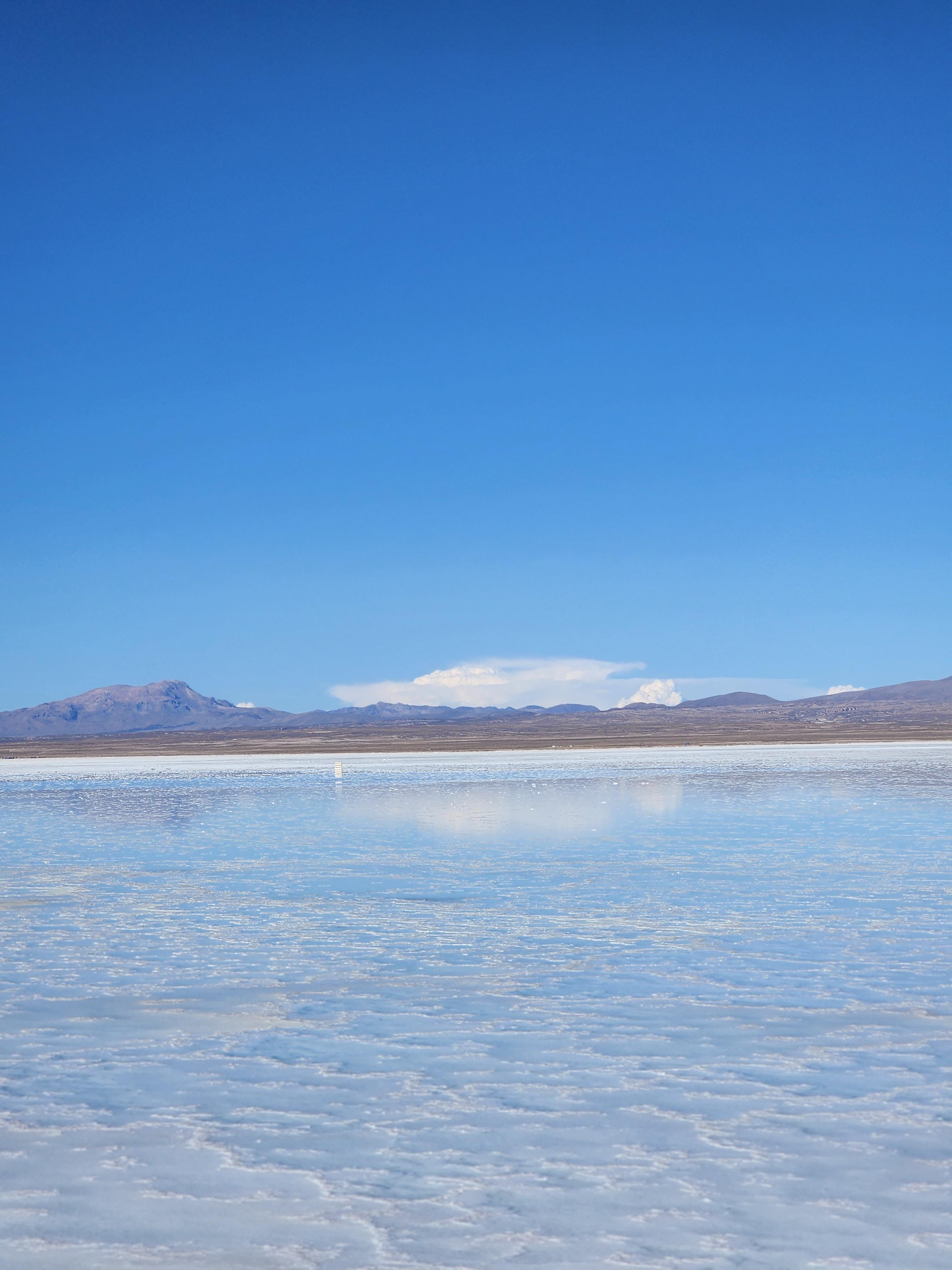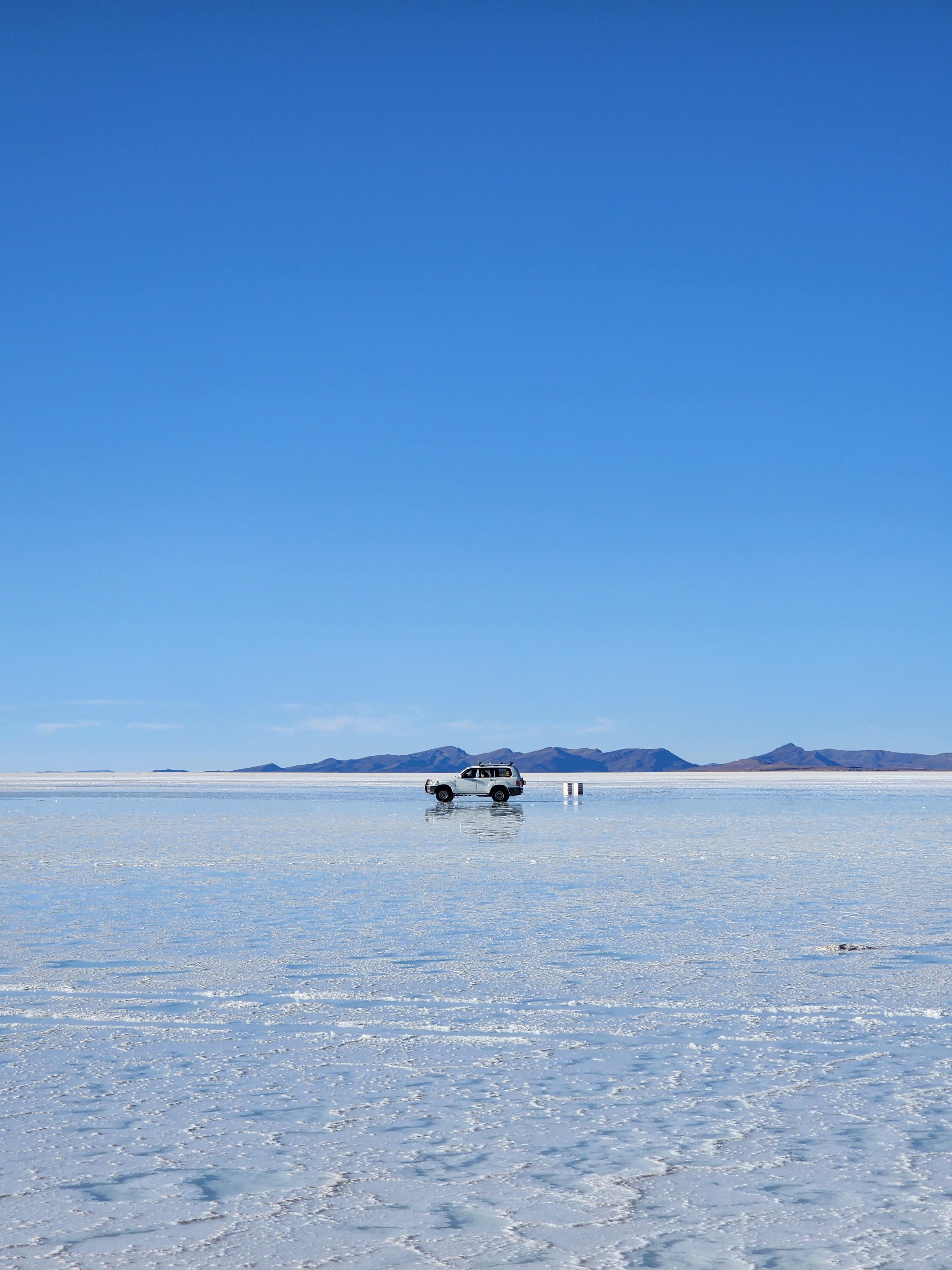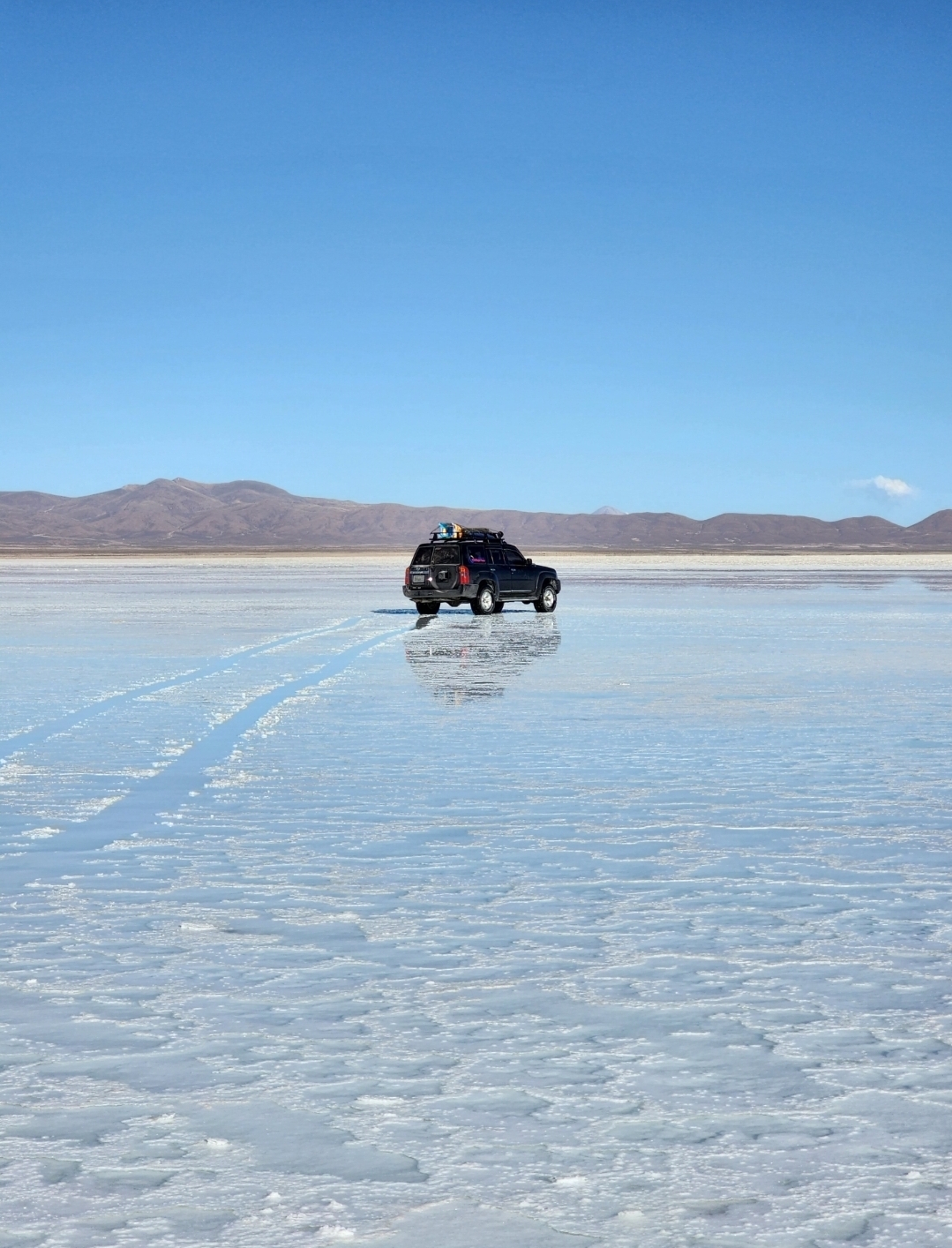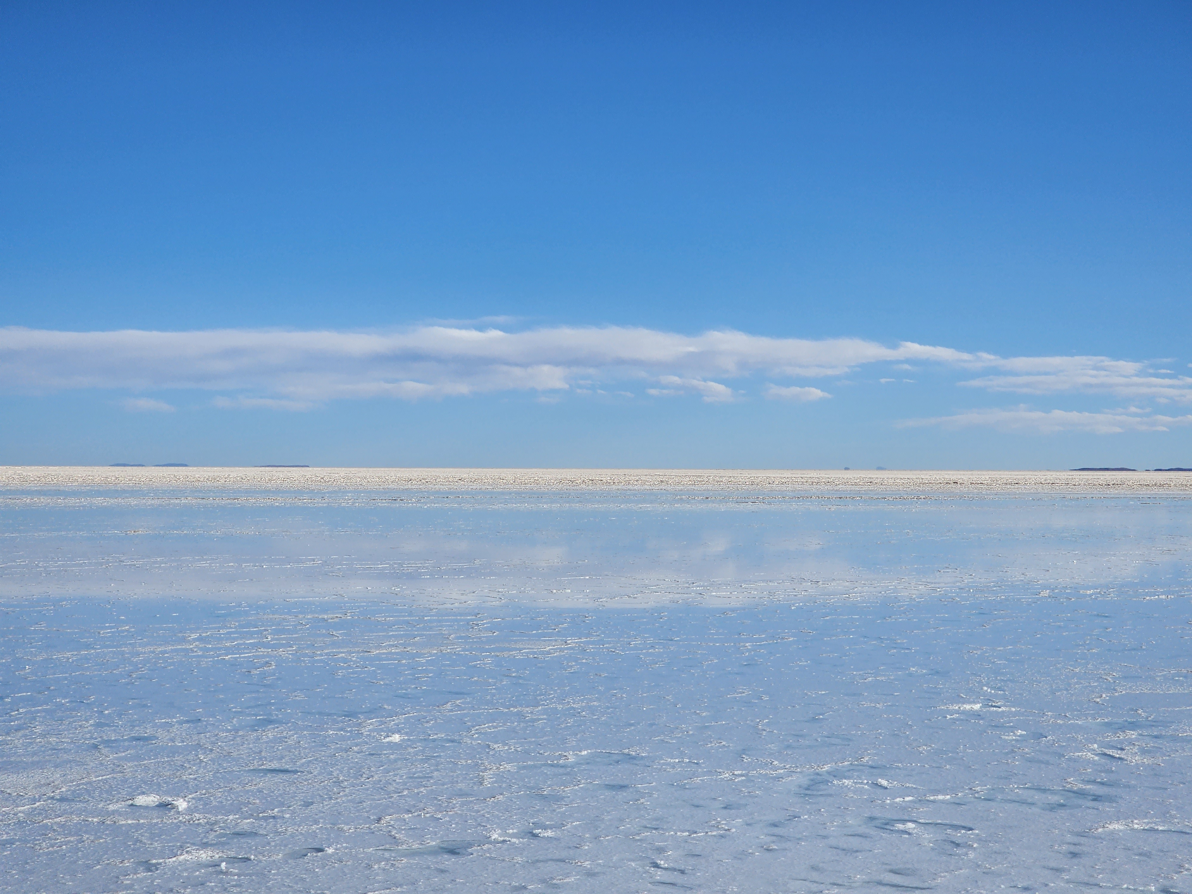 정신없이 사진 찍으며 놀다가 아리엘이 물이 있는 곳으로 가자고 해서 차를 탔다. 희고 까끌한 바닥을 지나며 저 먼 앞을 바라보니 회색빛 바닥과 다른 하얀빛 지평선이 언뜻언뜻 보이기 시작한다. 콜차니 마을 입구에서부터 보였던 떠 있는 듯이 보이는 산도 더 선명히 보인다. 어느 순간 우리는 물이 찬 우유니 사막에 들어와 있더라.