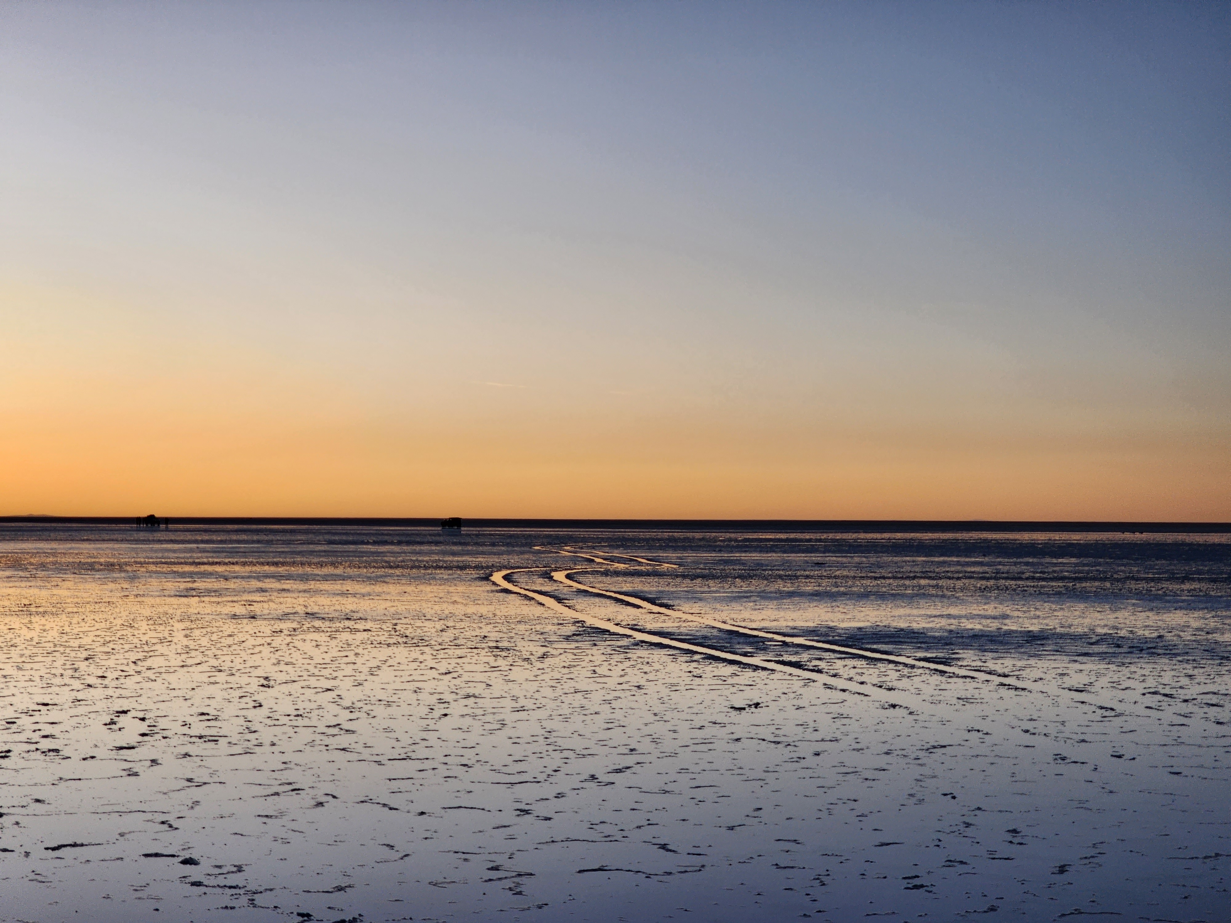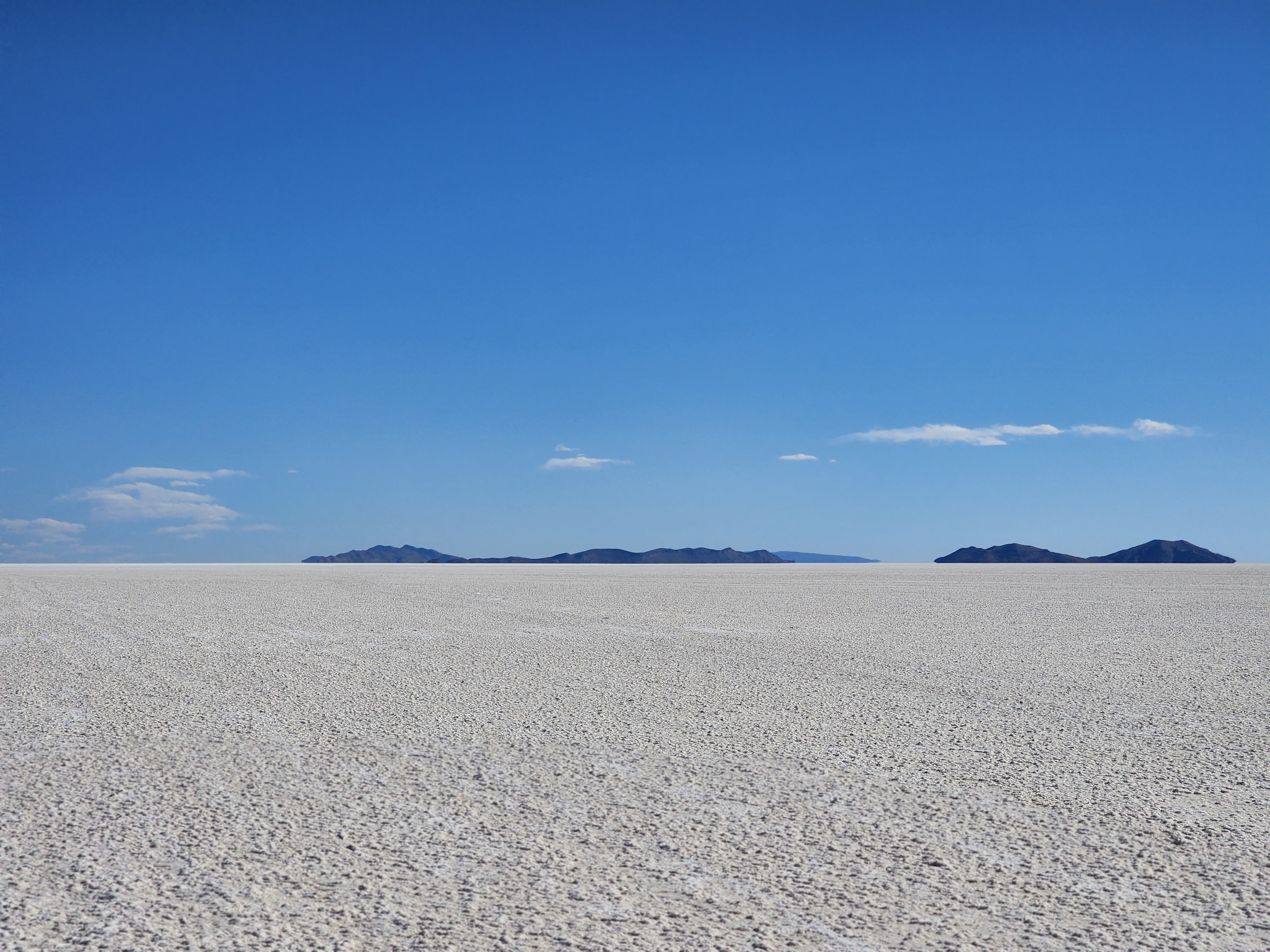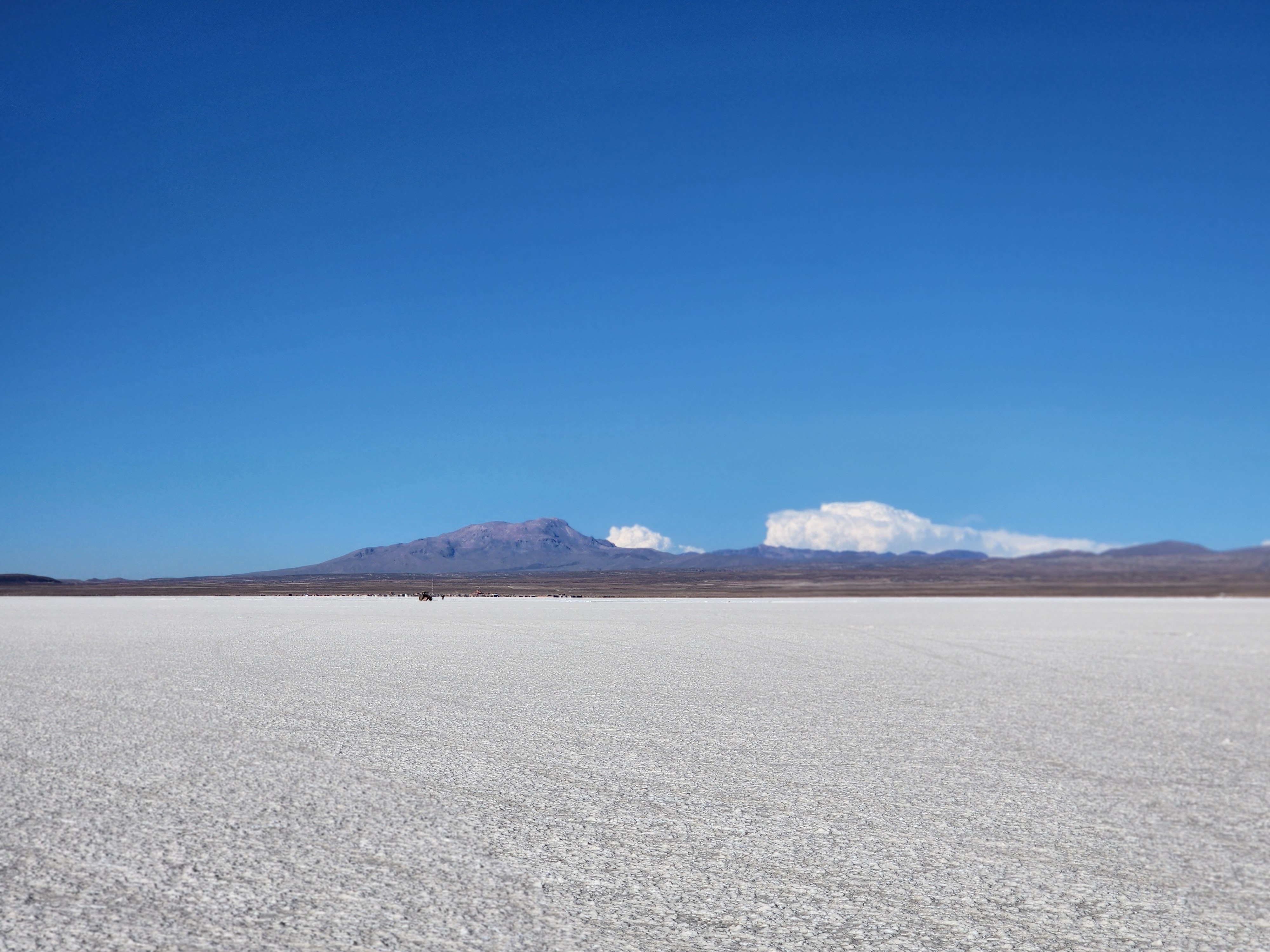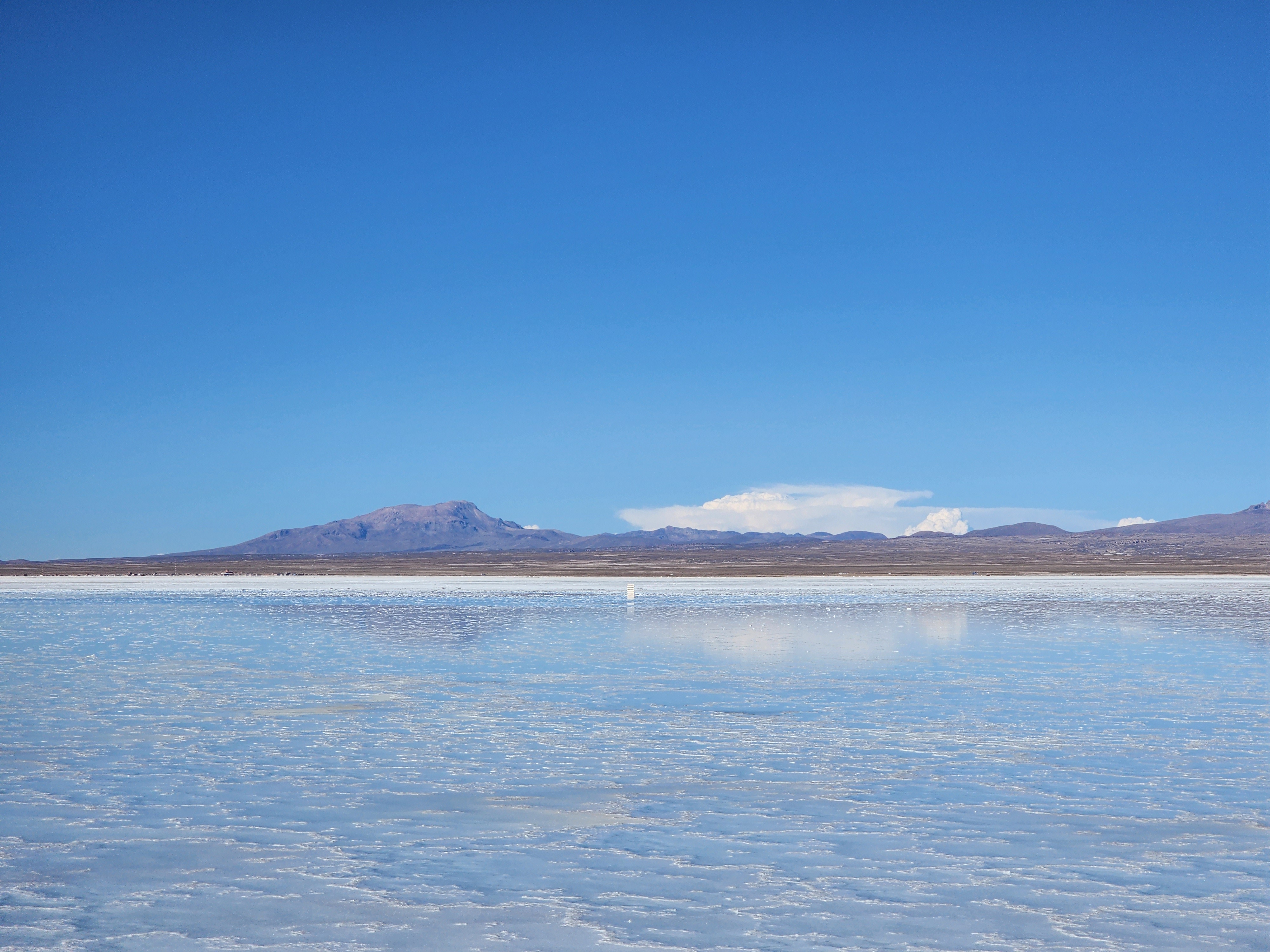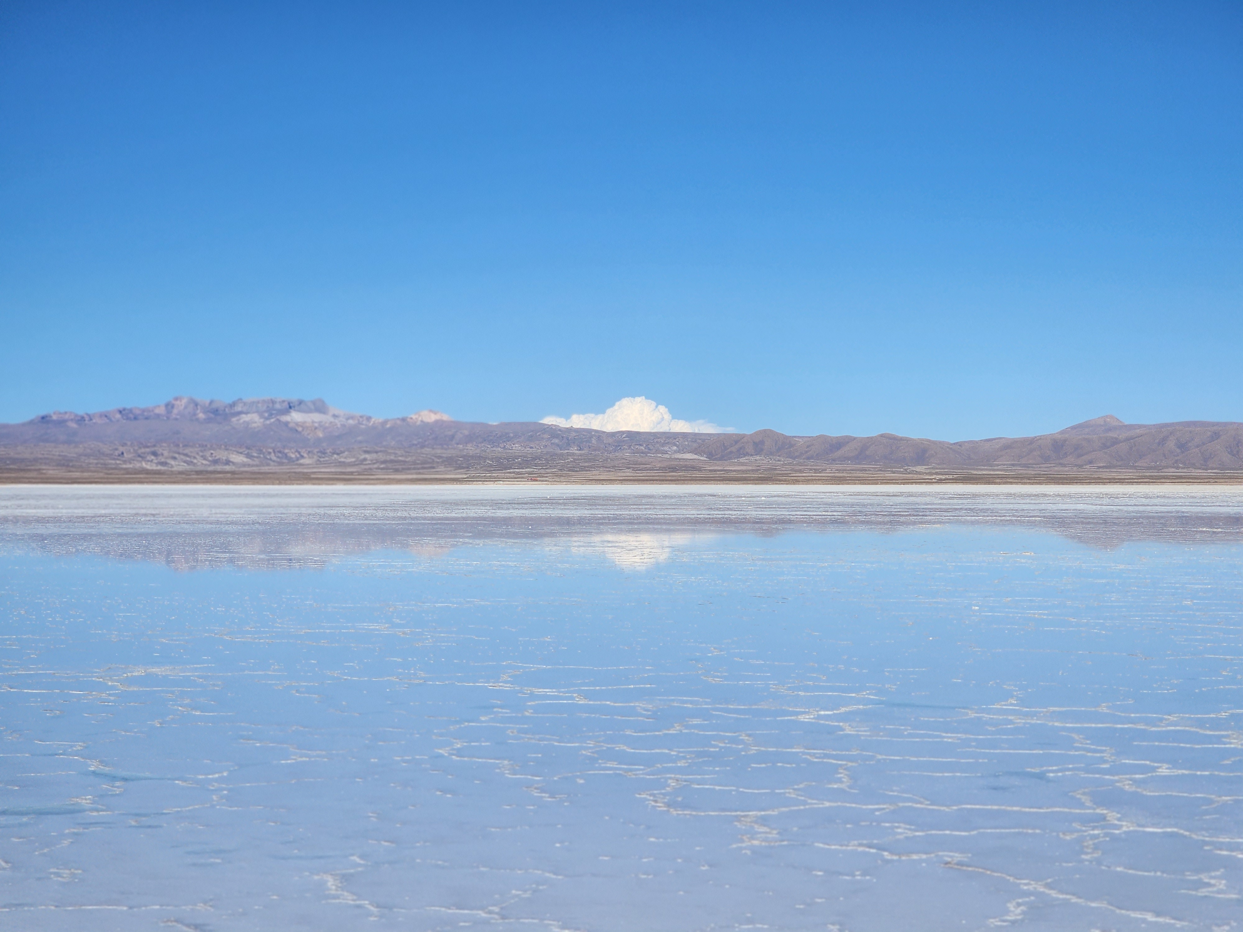정신없이 사진 찍으며 놀다가 아리엘이 물이 있는 곳으로 가자고 해서 차를 탔다. 희고 까끌한 바닥을 지나며 저 먼 앞을 바라보니 회색빛 바닥과 다른 하얀빛 지평선이 언뜻언뜻 보이기 시작한다. 콜차니 마을 입구에서부터 보였던 떠 있는 듯이 보이는 산도 더 선명히 보인다. 어느 순간 우리는 물이 찬 우유니 사막에 들어와 있더라.