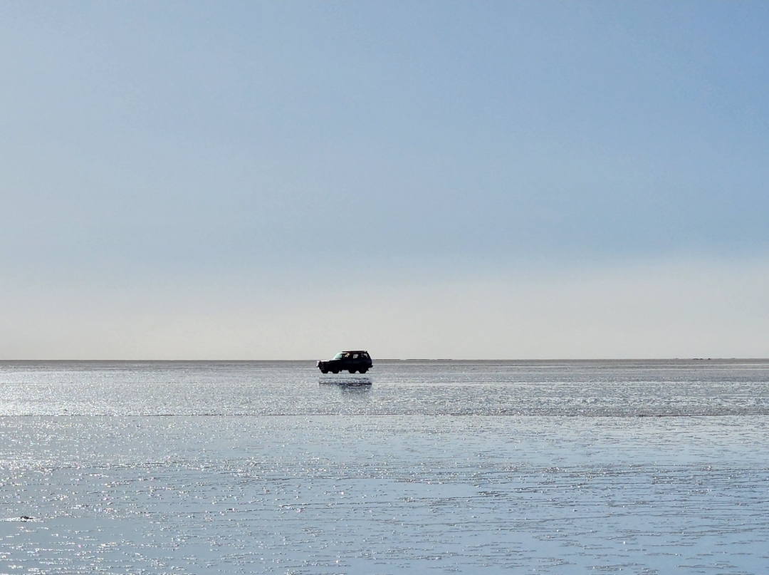 조금 더 사막을 돌아다니고 나서야 아리엘의 눈에 차는 스팟에 도착한 듯했다. 이제 내려서 돌아다녀도 된다는 말에 다들 즉각 문을 열고 내려섰다. 까칠하고 건조해서 딱딱했던 아까의 회색 바닥과는 다르게 발을 내리자마자 물이 첨벙 하고 튄다. 찰박거리며 사막을 걸어 다니다 보면 얇은 소금층이 깨져 발이 푹 빠지기도 하는데, 층을 깨뜨리는 게 재미있어 이리저리 돌아다녔다.