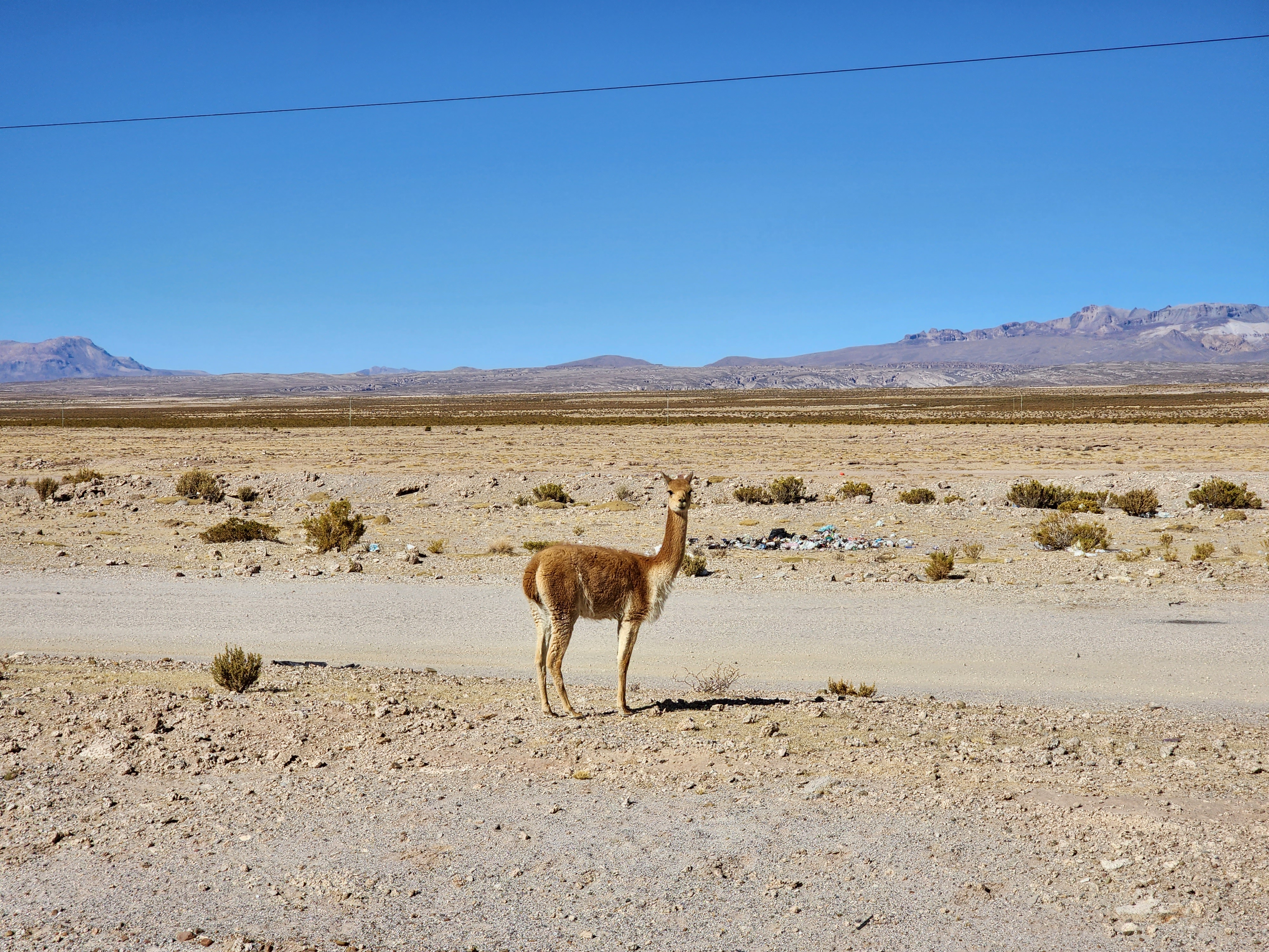 숙소와 식당이 모여있는 마을에서 우유니 사막까지는 30분 정도 칙칙하고 건조한 도로를 달려야 한다. 도로를 달리다 보면 저 멀리 공중에 떠 있는 듯한 산이 보이는데, 우유니 사막이 가까워지고 있다는 신호 같아 들뜬다. 가는 도중에 간간히 라마가 보이는데, 어느 웅덩이 근처에서는 온갖 색의 털을 가진 라마 무리가 돌아다니고 있는 것도 보았다. 그리고 내가 정말 궁금해했던 야생 비쿠냐도 만났다! 마치 고상한 사슴처럼 생겼던데 우리가 차 속도를 늦추니 지레 겁먹고 도망가려 하더라.