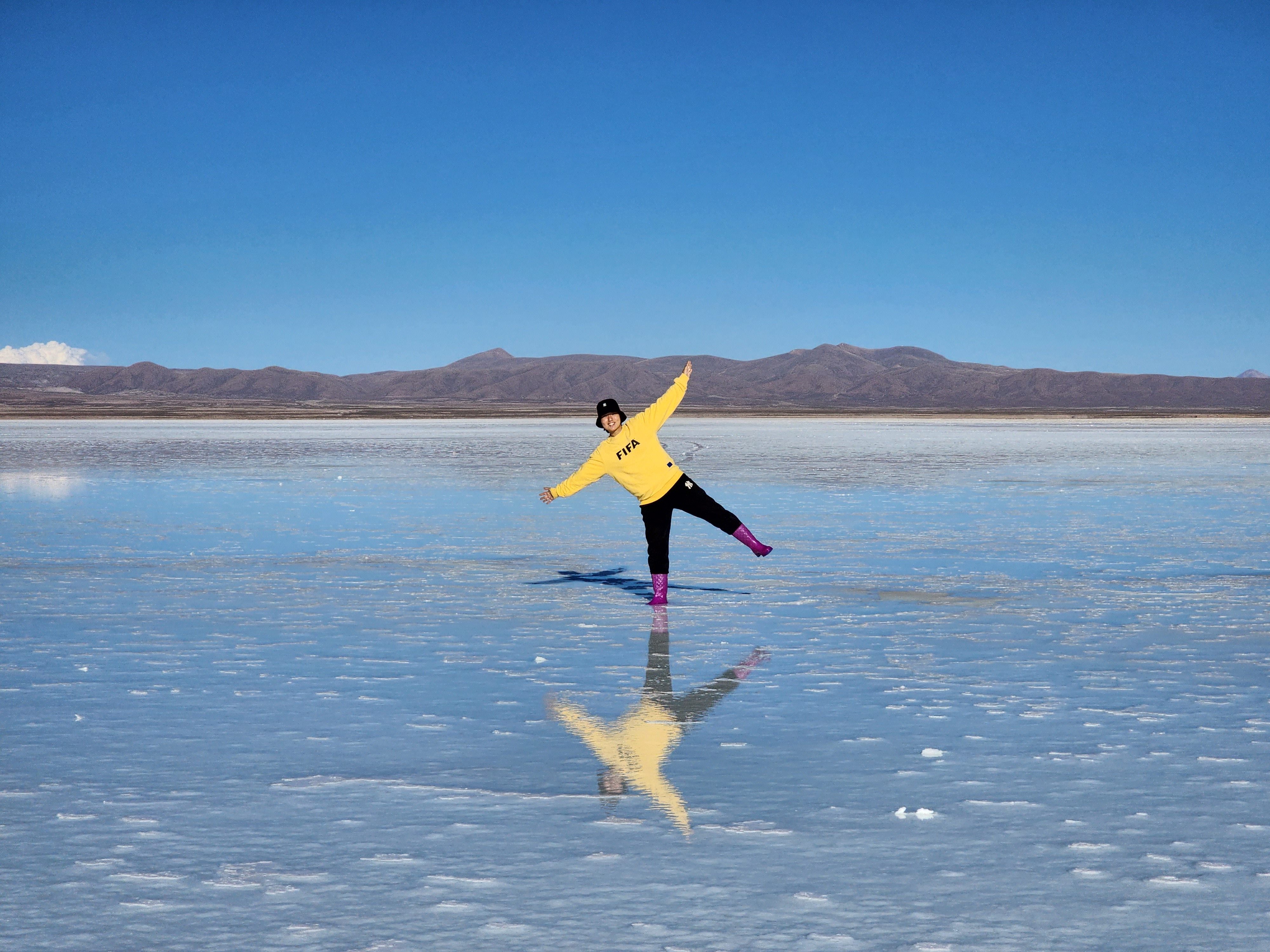 우리가 소금사막을 돌아다니며 너무 좋아하니까 아리엘이 자기는 차를 끌고 따라갈 테니 우리는 걸어서 저쪽까지 가면 된다고 해준다. 소금사막까지 왔는데 무슨 차야, 무조건 걸어야지! 아리엘이 가리킨 방향으로 걸어가니 물이 아까보다 더 많이 고인 게 한눈에 보인다. 바닥에 반영된 하늘도 조금 더 부드럽게 보인다.