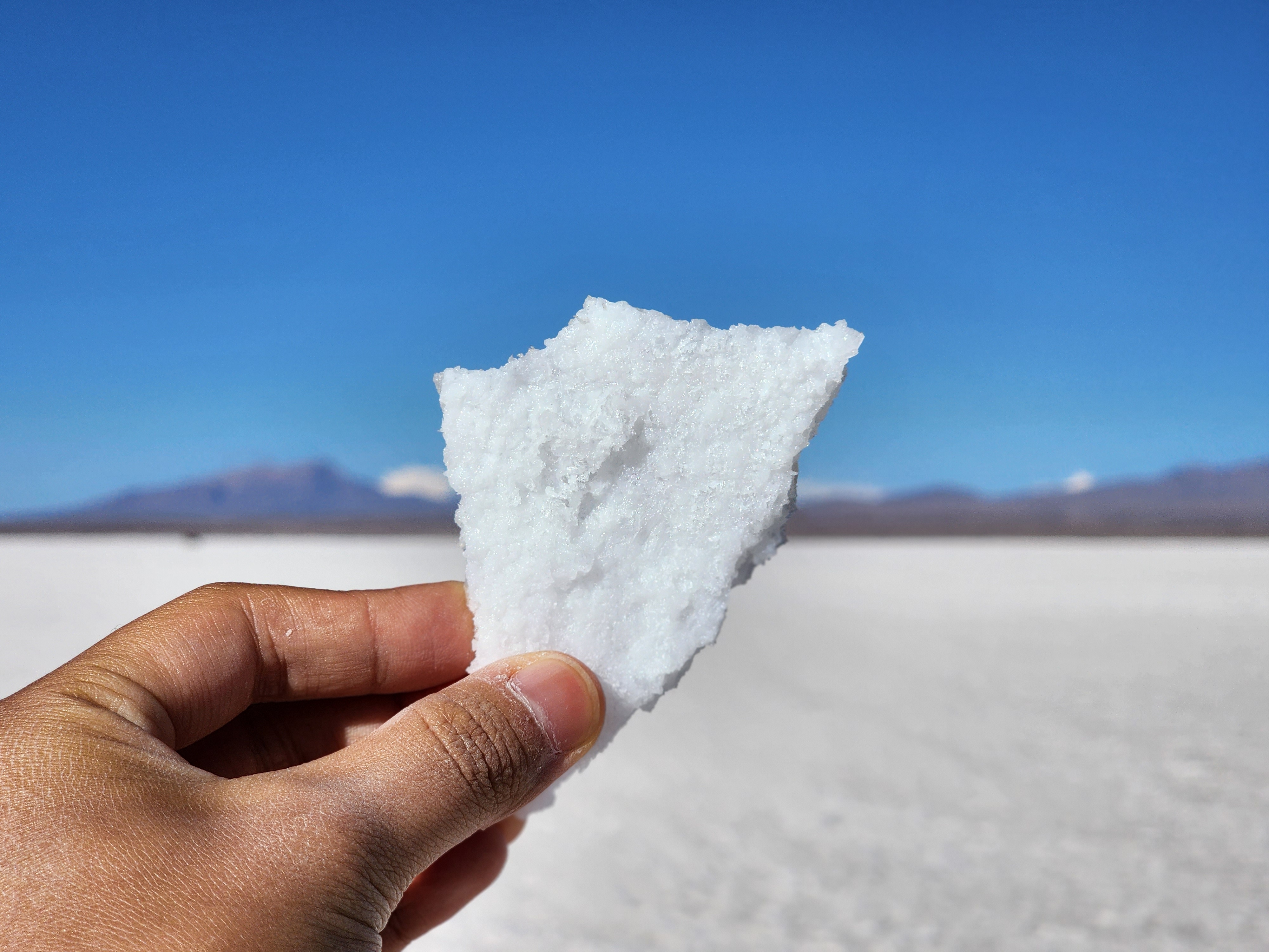 물론 우리는 여기서부터도 신났다. 신생 투어사이다보니 장화도 새것처럼 깔끔한 것들로 준다. 외국형 발 사이즈를 잘 몰라도 아리엘이 눈대중으로 각자에게 딱 맞는 신발을 줘서 감탄했다. 친구는 파란색 장화를, 나는 보라색 장화를 신었다. 장화를 신고 갓 태어난 아기마냥 아장거리며 신나 돌아다니는 우리를 보더니 아리엘이 큰 소금 결정을 하나 떼어 주었다. 다들 해보는 것처럼 살짝 맛을 봤는데 역시나 짜다!