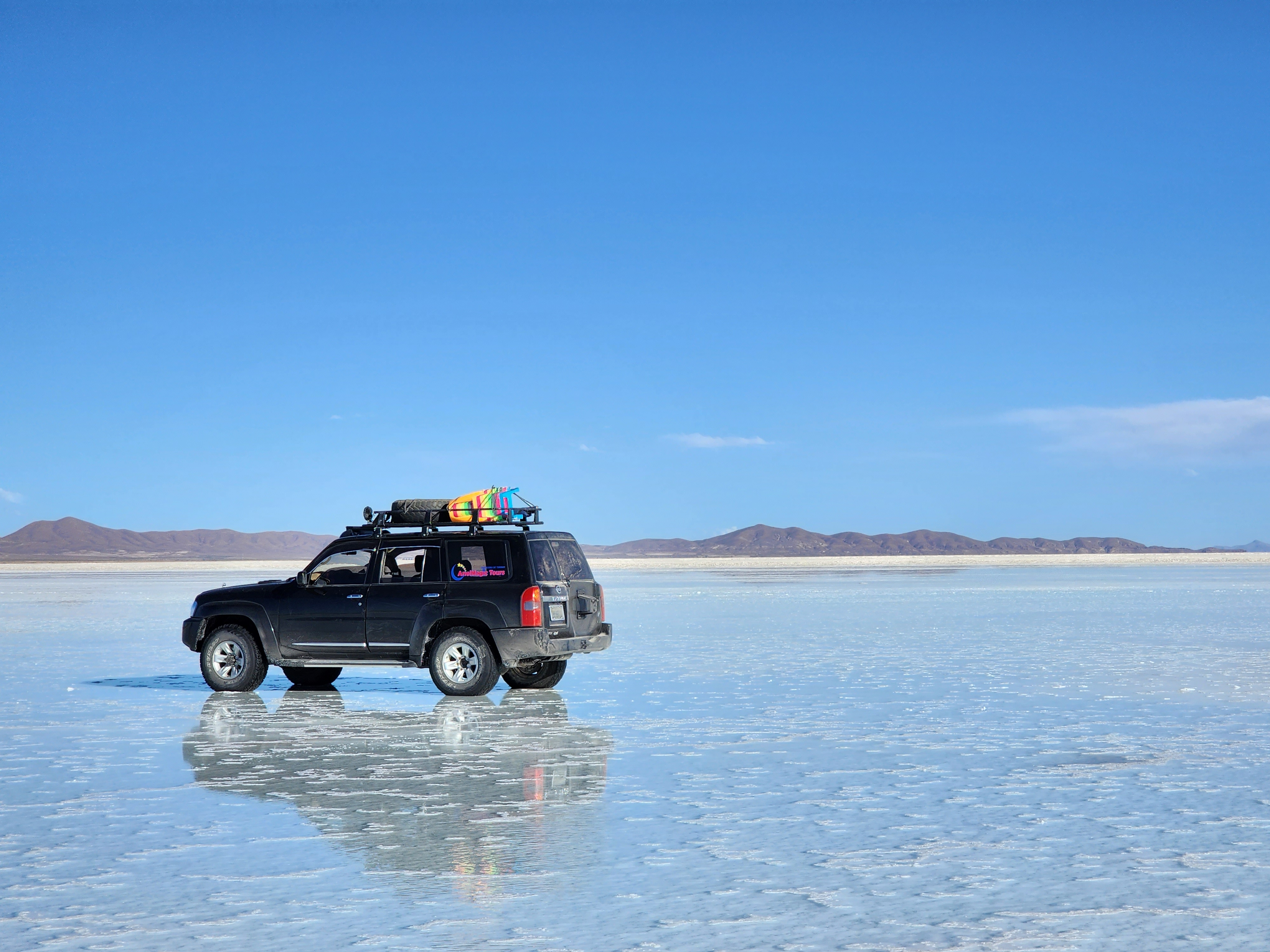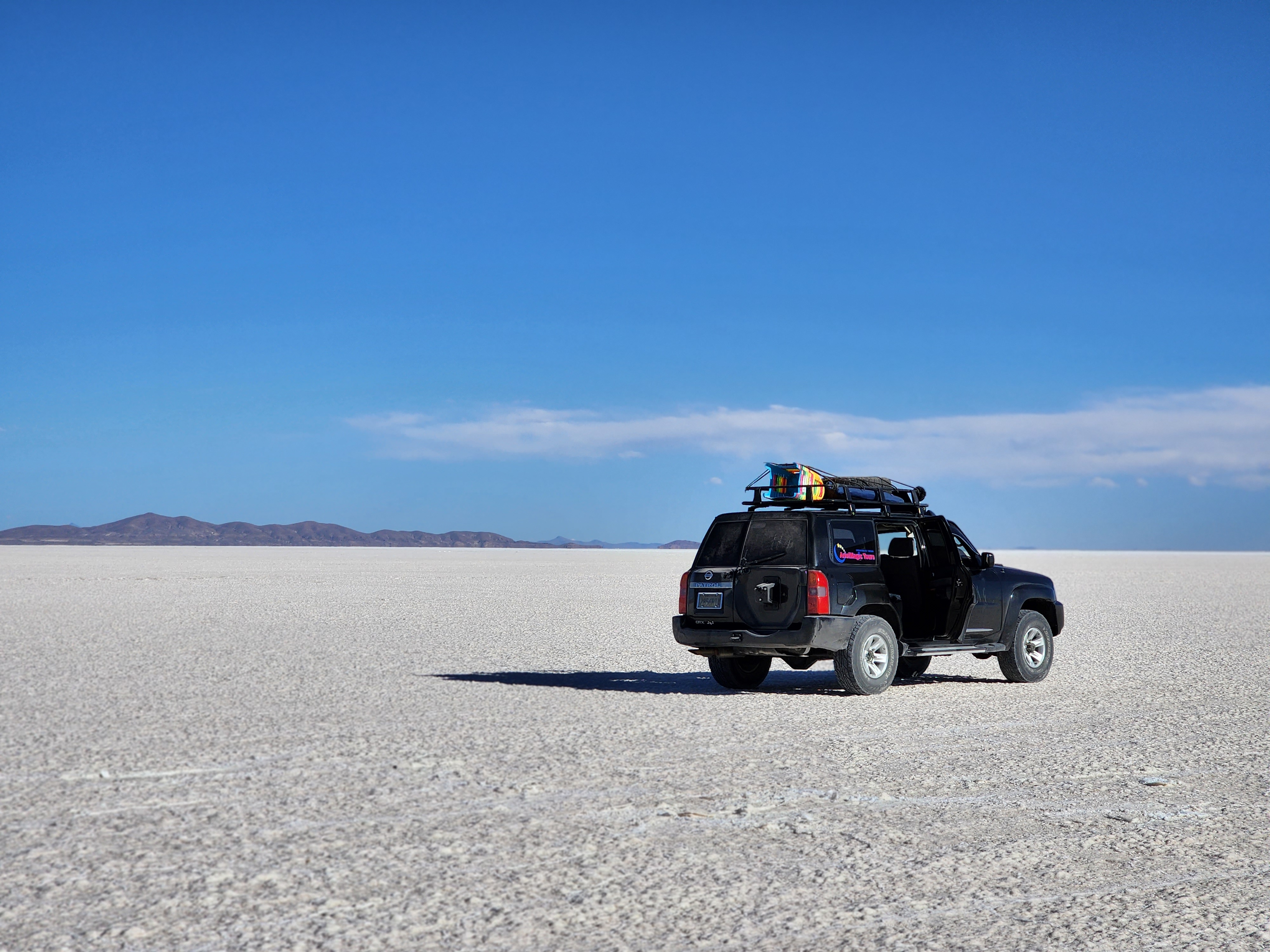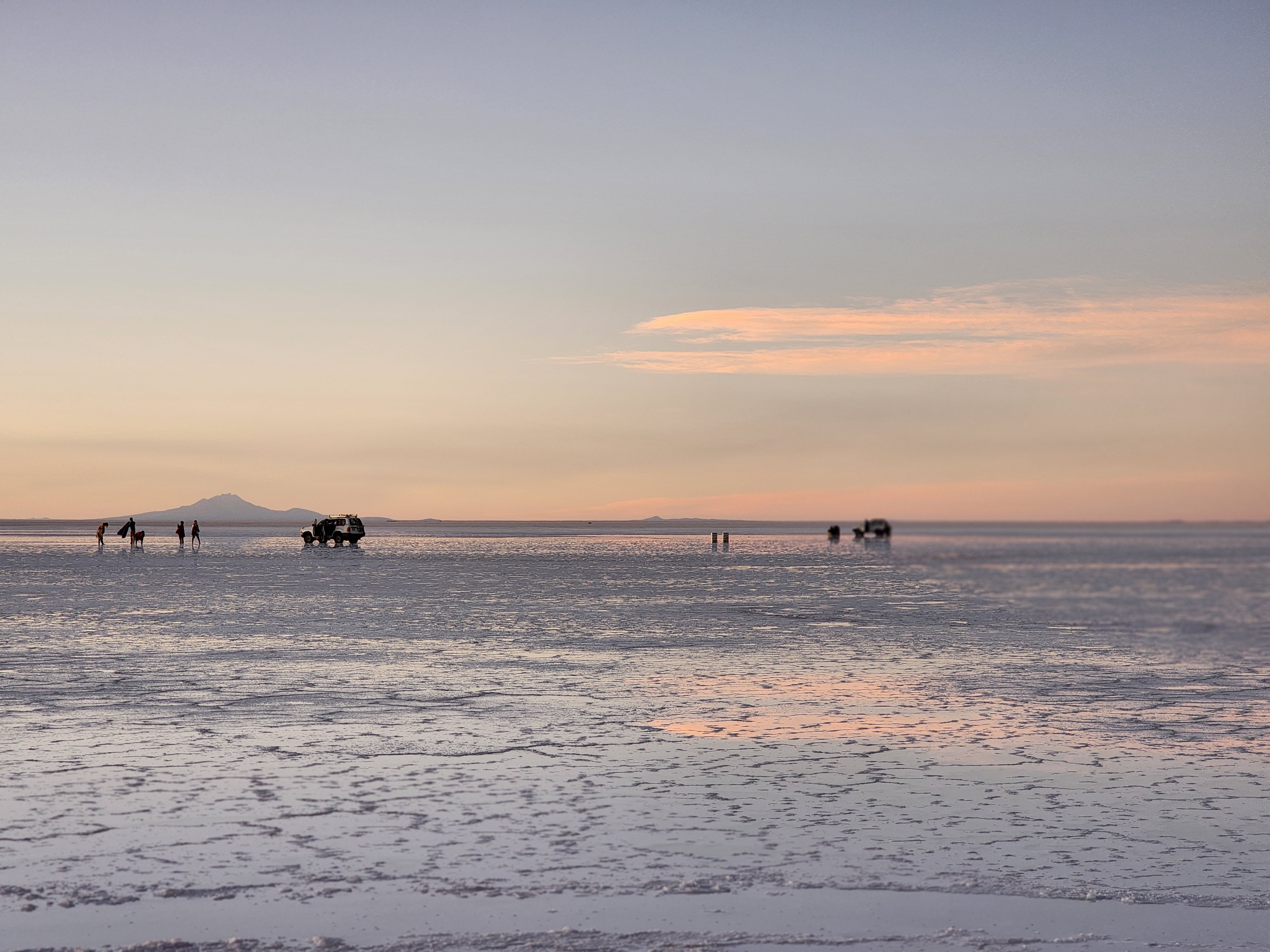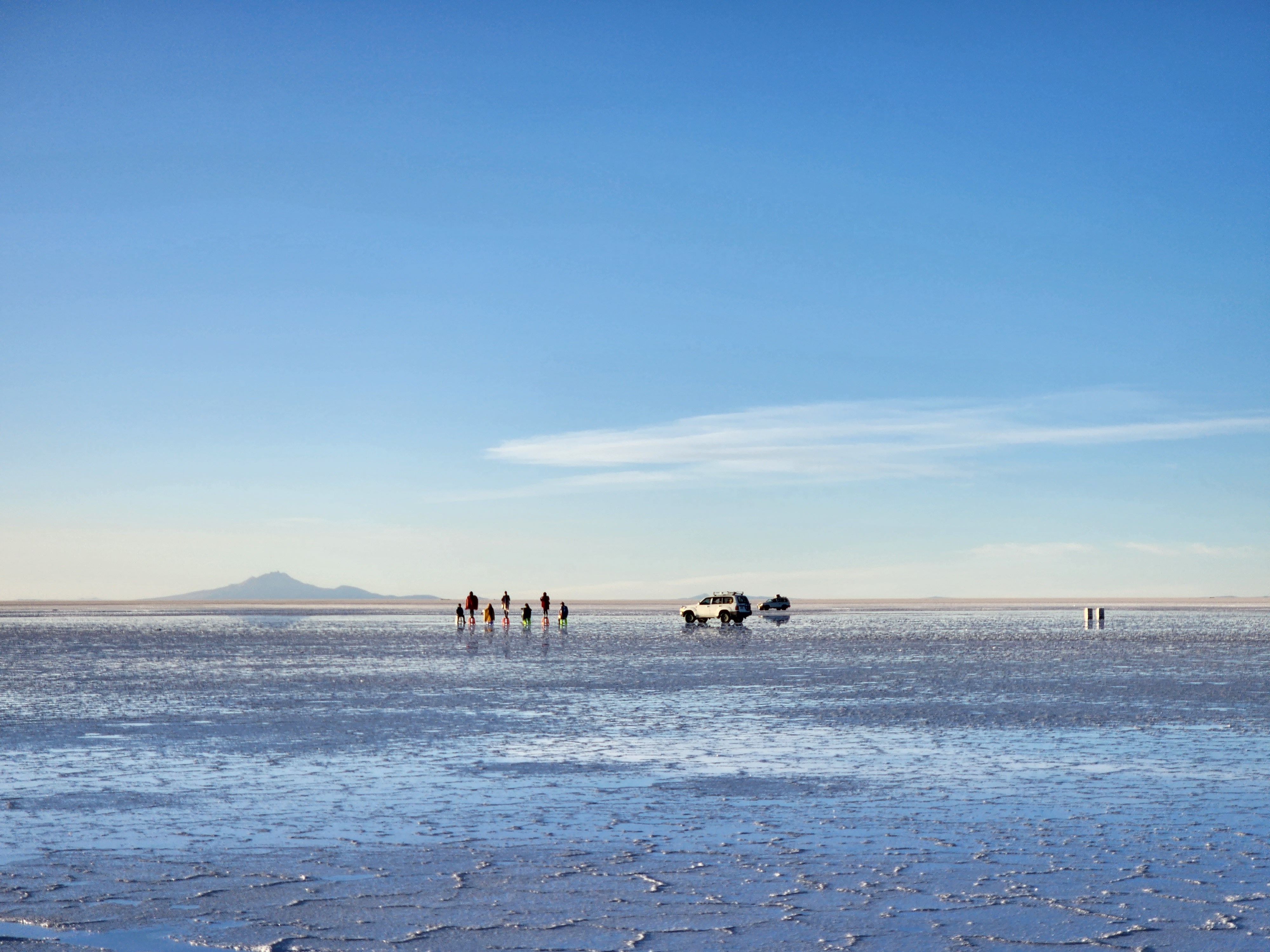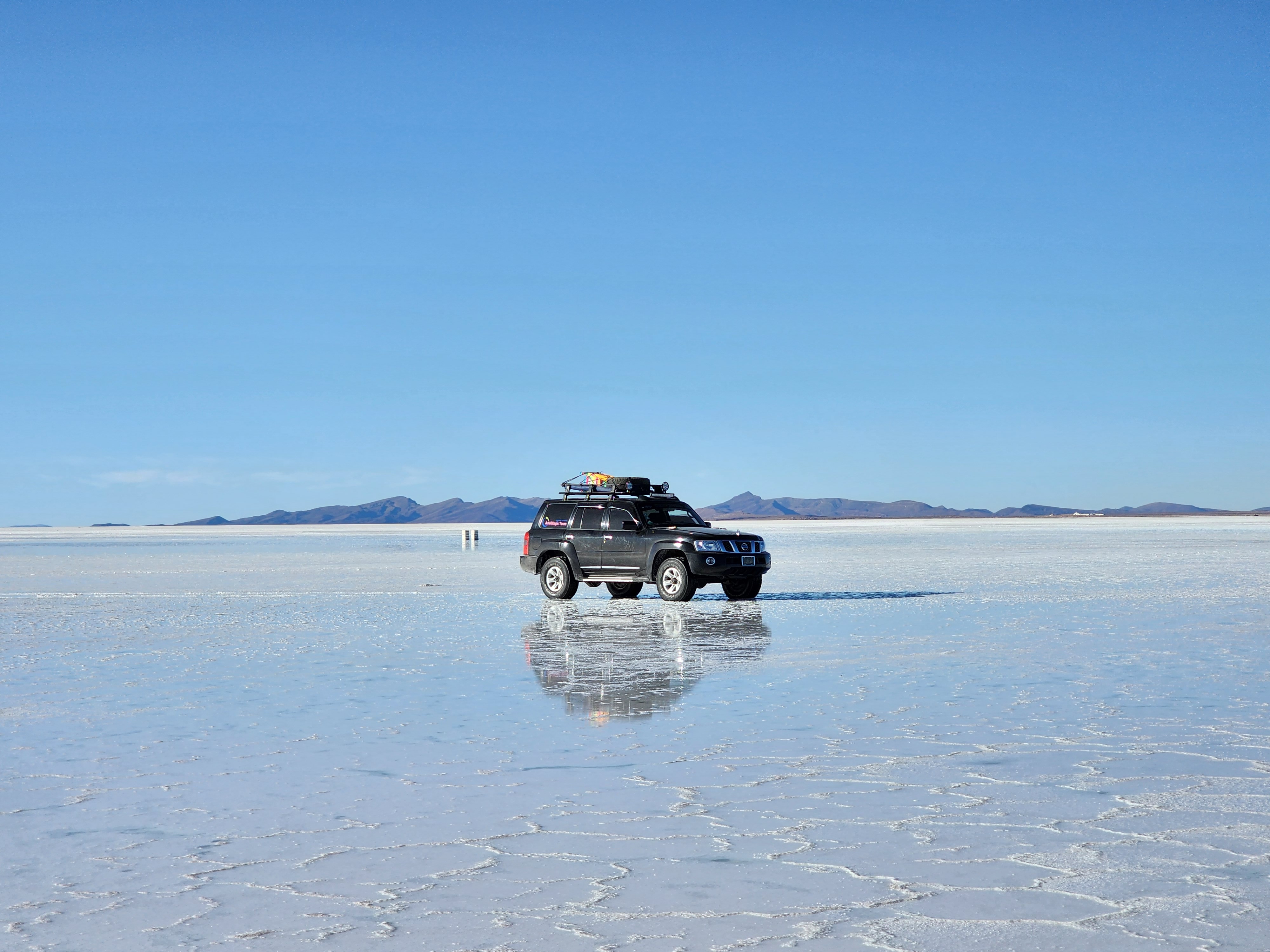 주위를 둘러보면 우리 말고도 다른 투어사에서 온 팀이 여럿 보인다. 그들이 타고 온 지프차를 피사체 삼아 우유니 사막을 찍는 것도 재미있다. 옛날에 몽골 여행을 갔을 때 건물이 하나도 없는 길을 달리며 하늘이 이렇게 높고 넓을 수 있었나 감탄했던 기억이 있는데, 우유니를 보니 몽골은 비교도 안 되는 것 같다.