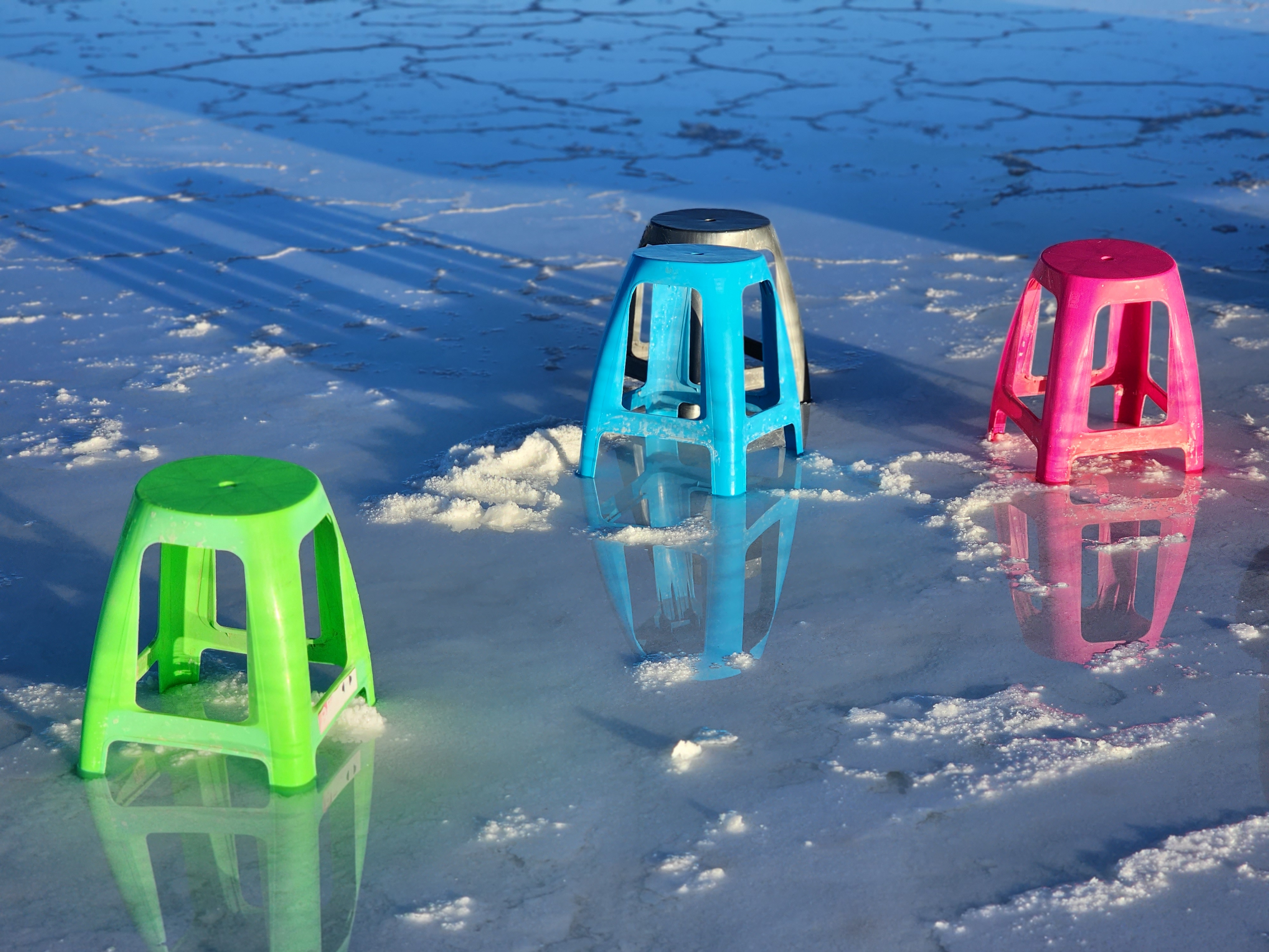 사실 나는 우유니 투어 하면 자주 등장하는 원근 사진(공룡과 프링글스 등)과 요상한 의자 단체 사진은 좋아하지 않았는데, 막상 흰 사막 바닥을 밟으니 이것저것 많이 찍어가고 싶어지더라. 그래서 친구와 재미난 원근 사진도 몇 개 찍으면서 한참을 놀았다.
